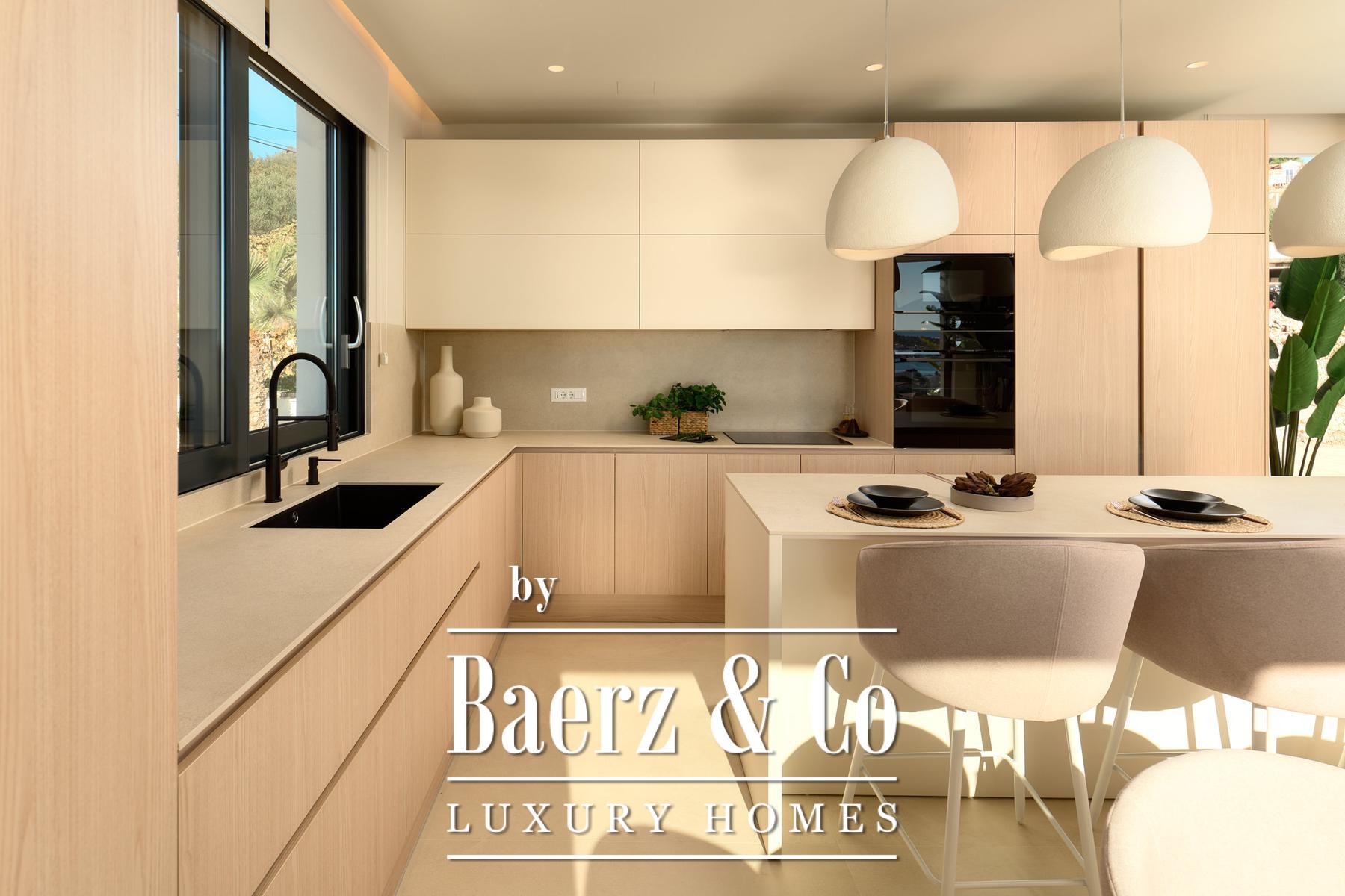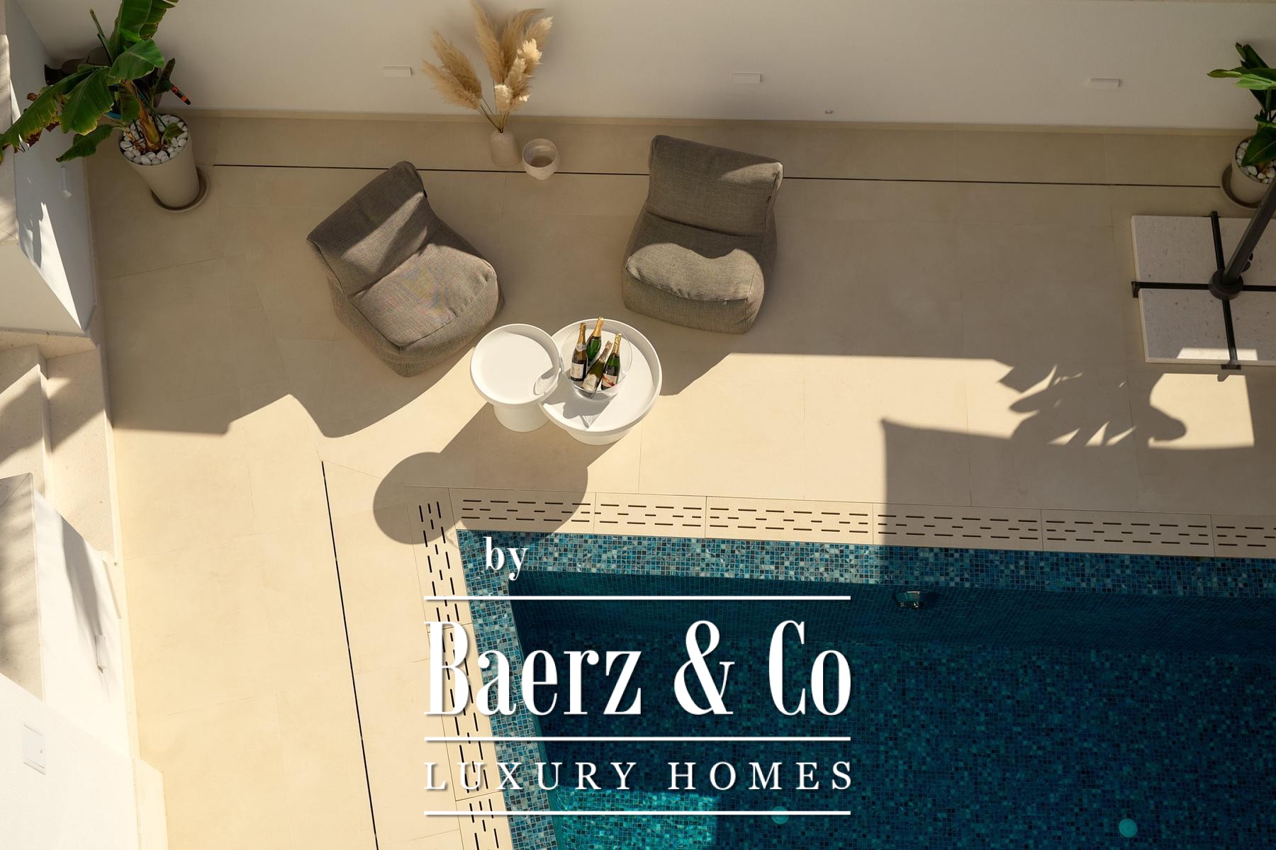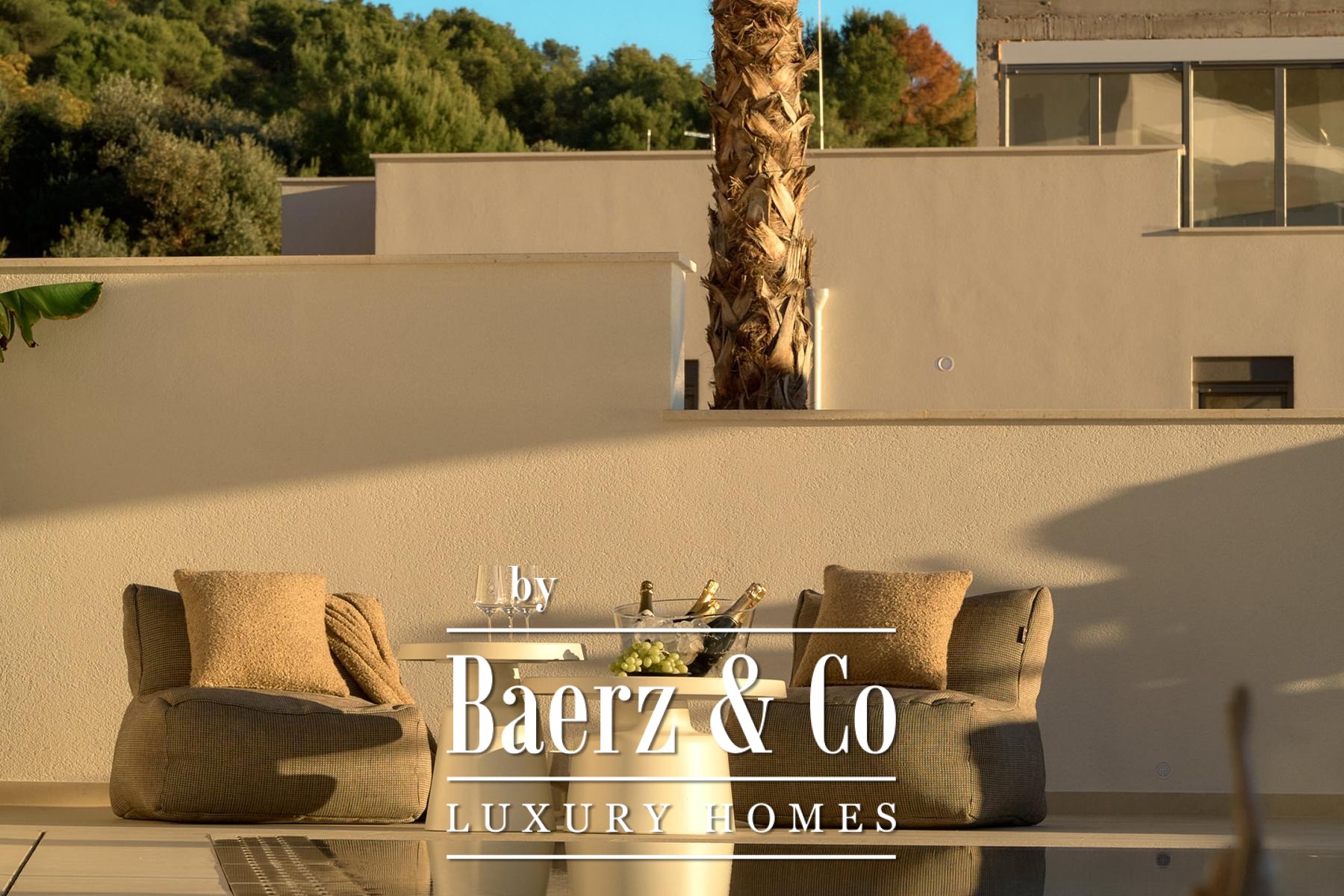 De bouwkwaliteit is compromisloos met plafondairconditioning, vloerverwarming via warmtepompen, gebalanceerde ventilatie, thermische isolatie, aluminium kozijnen, glazen balustrades, zonnepanelen, automatische tuinirrigatie en videobewaking. Twee onoverdekte parkeerplaatsen en mediterrane tuinaanleg completeren het geheel.