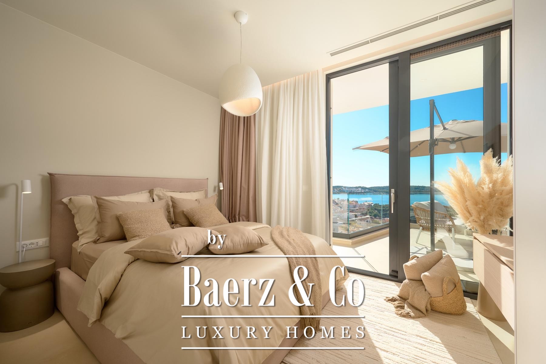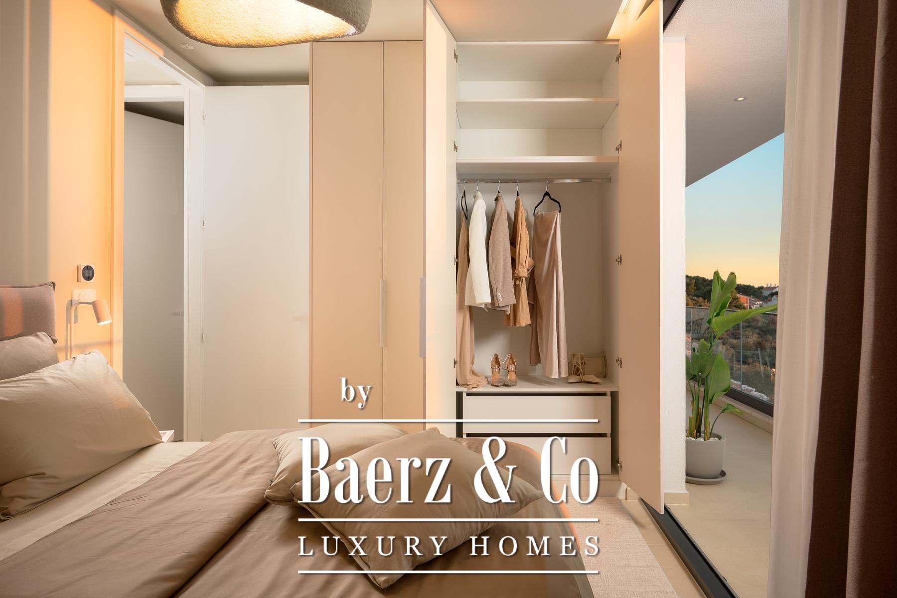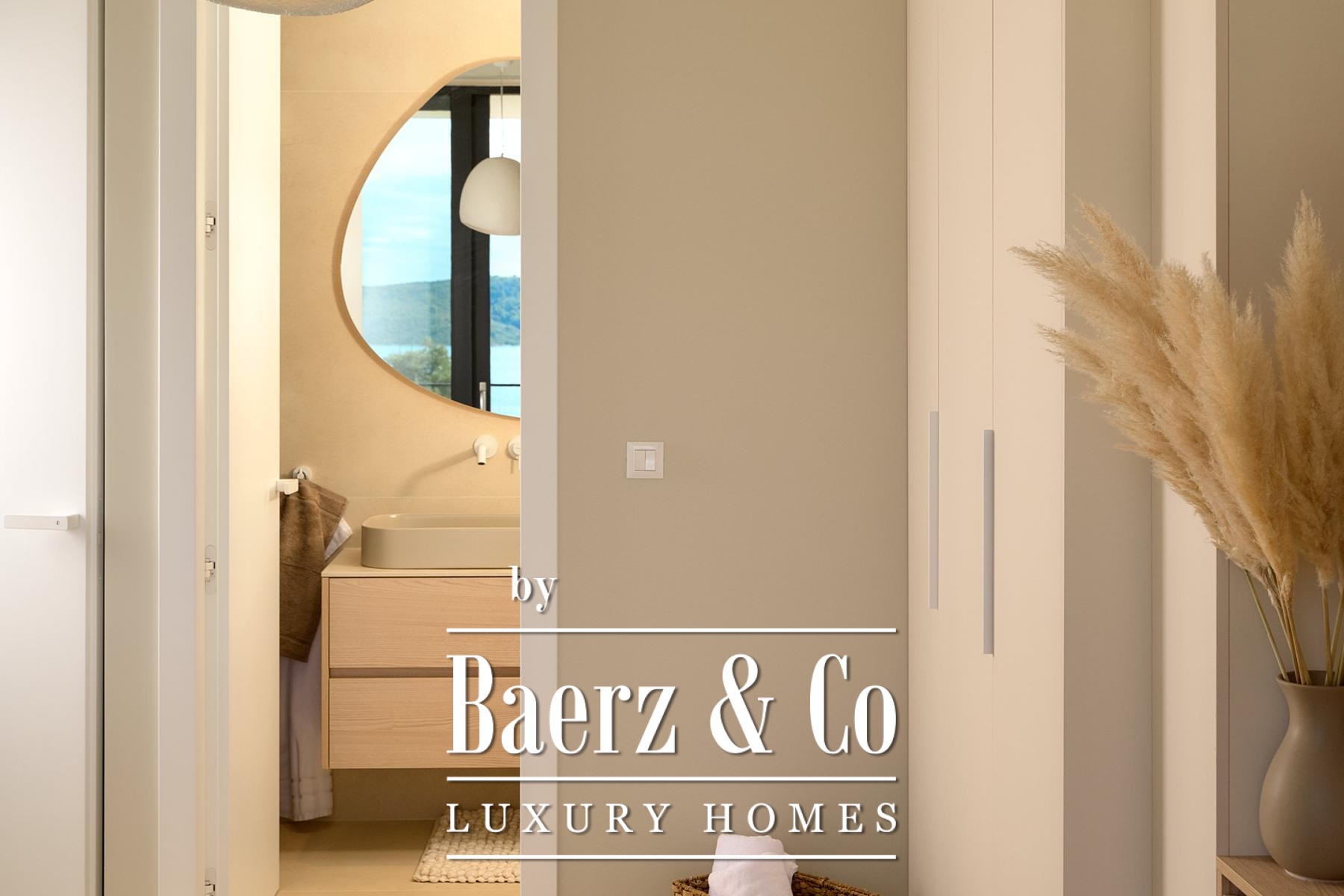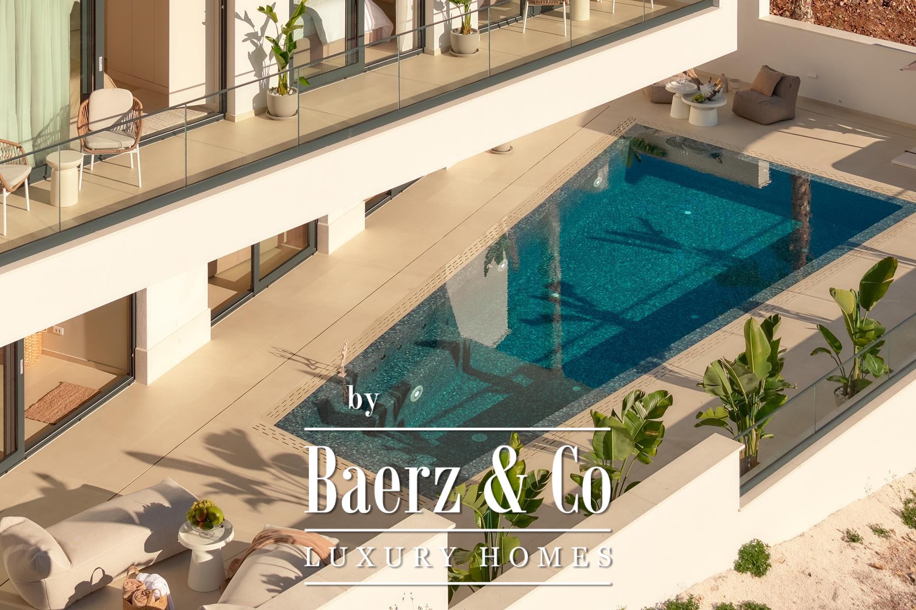 Drie slaapkamers met en-suite badkamers op de begane grond bieden direct toegang tot een loggia van 18,8 m². De privé garage van 31 m² is voorzien van een laadpunt voor elektrische voertuigen. Op de eerste verdieping bevindt zich een riant woonvertrek van 52 m², aangevuld met een vierde slaapkamer, een extra badkamer en royale terrassen, allemaal georiënteerd op de glinsterende horizon.