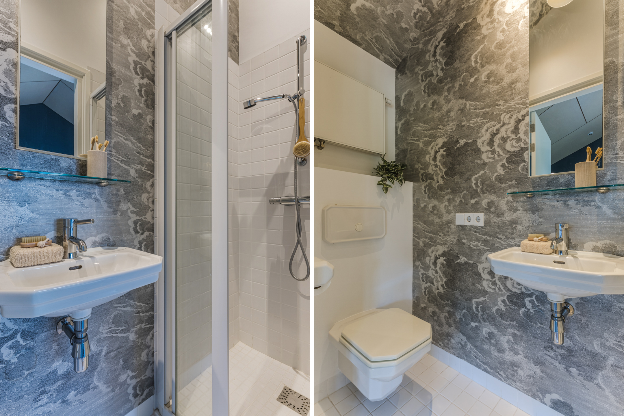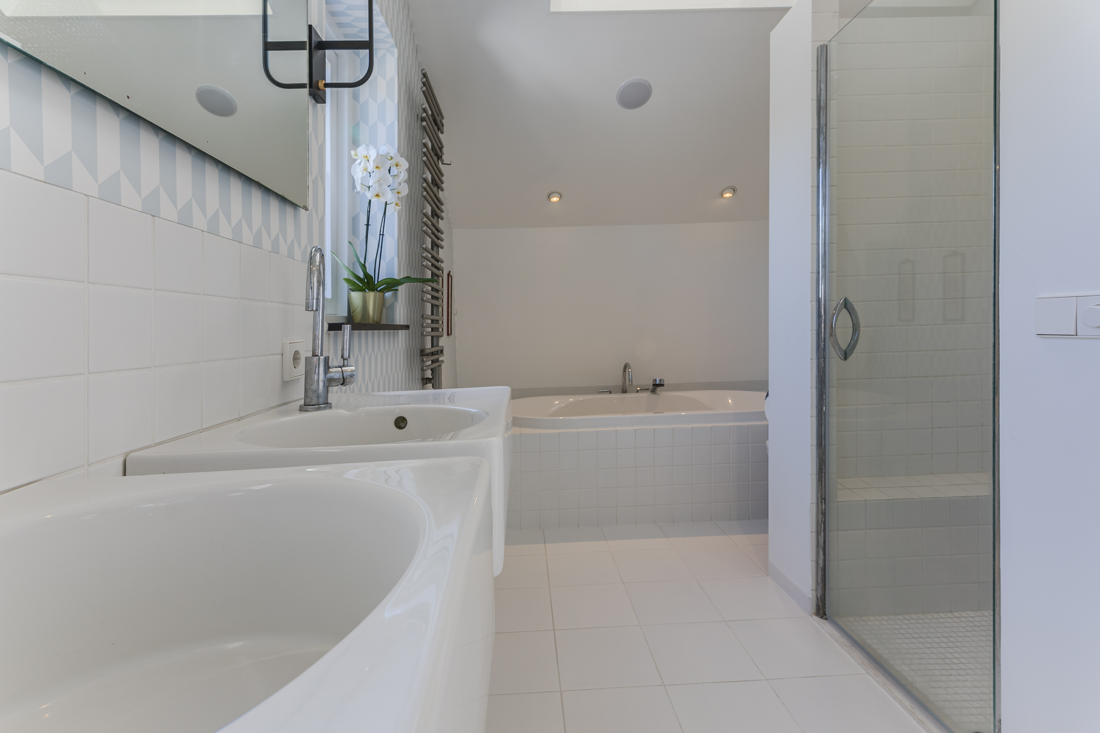 De betegelde badkamer is voorzien van vloerverwarming, een ligbad, een inloopdouche, wandcloset, wastafel, spiegelverwarming en instelbare mechanische ventilatie.