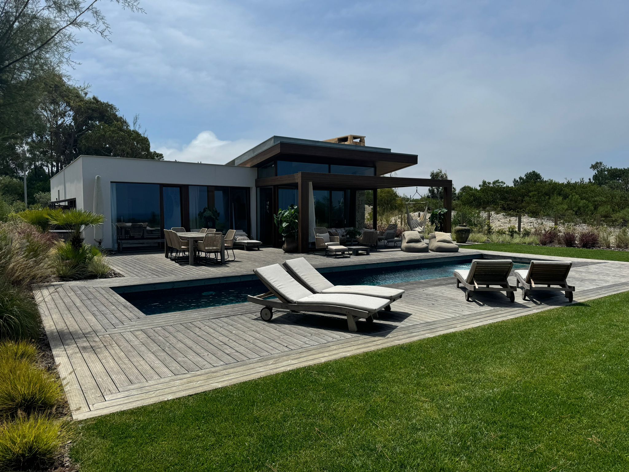 Buiten is er een meer dan royaal zwembad (10m x 3m), een groot houten terras en prachtig aangelegde tuin. Een fantastische ruimte voor ontspannende momenten en buitenmaaltijden met familie en vrienden.