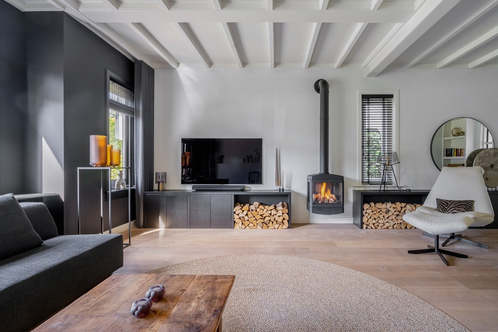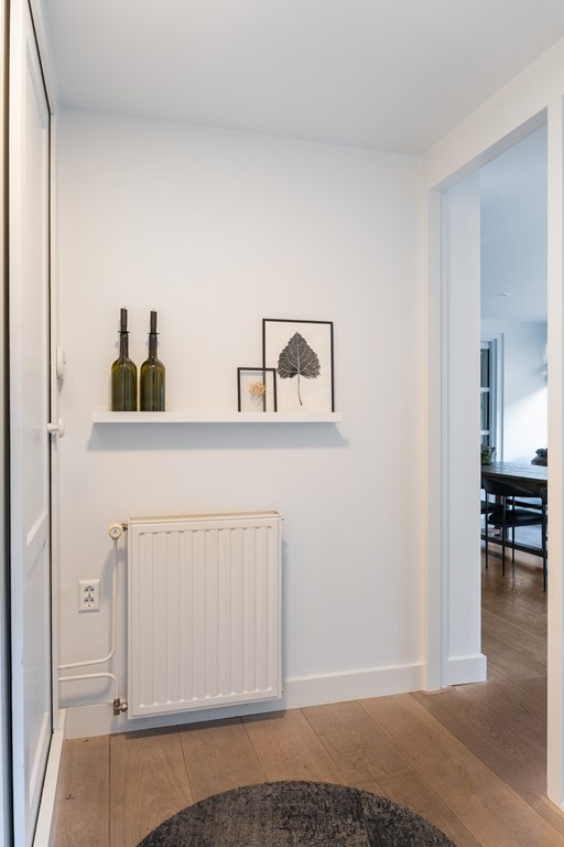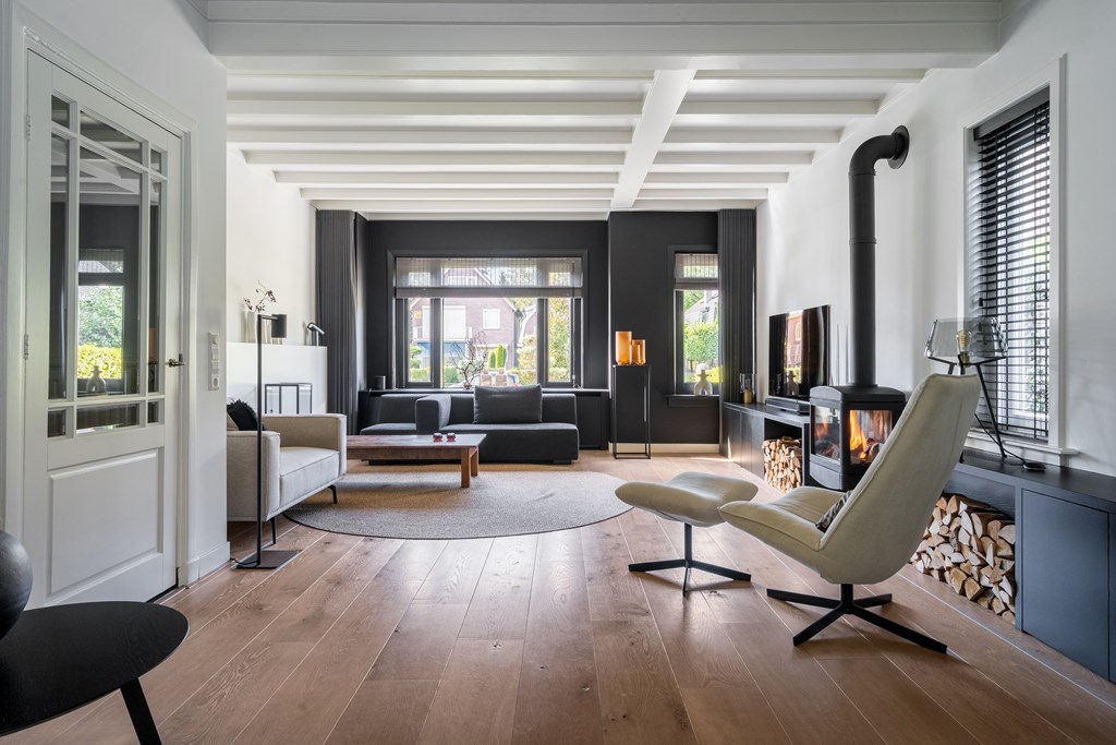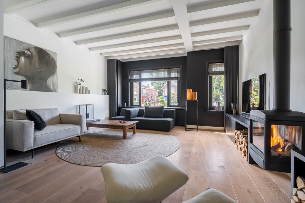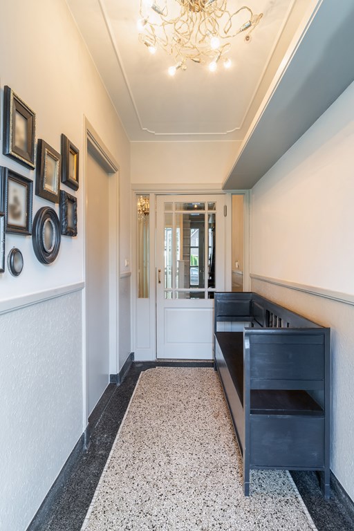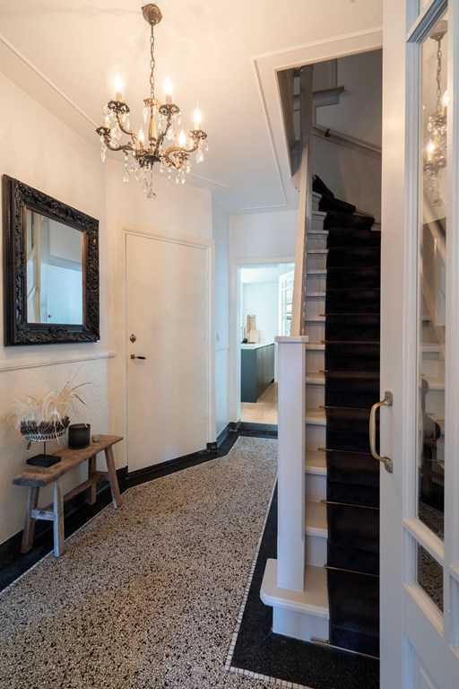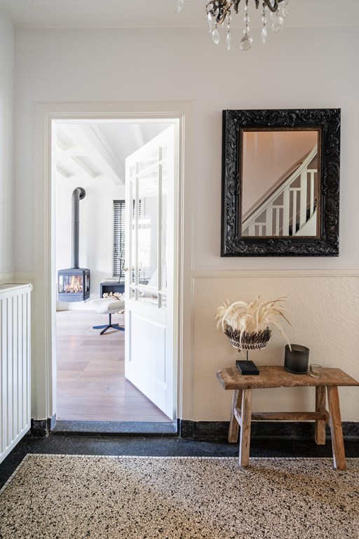 U komt binnen in de entree en hal, welke beiden voorzien zijn van een authentieke granito vloer. Via de entree en hal, toilet en trapopgang betreedt u de ruime woonkamer. De grote raampartijen zorgen voor veel lichtinval. De stijlvolle gashaard vormt een echte blikvanger en creëert een luxe, behaaglijke sfeer.