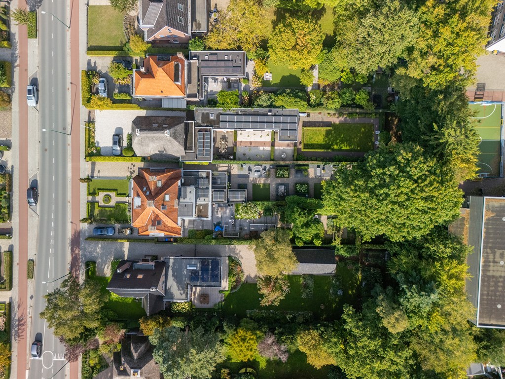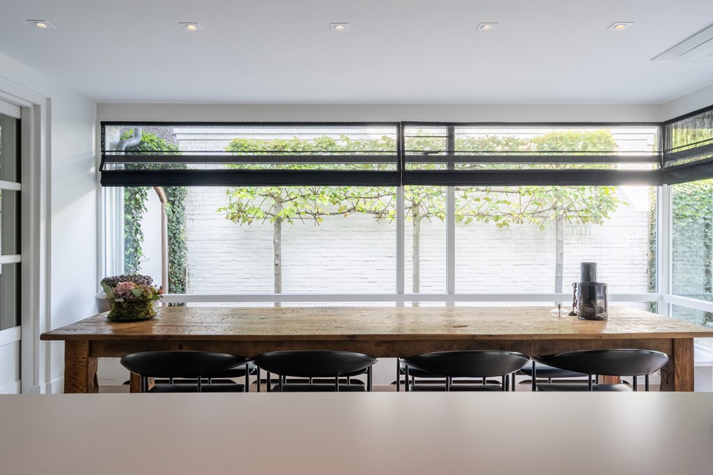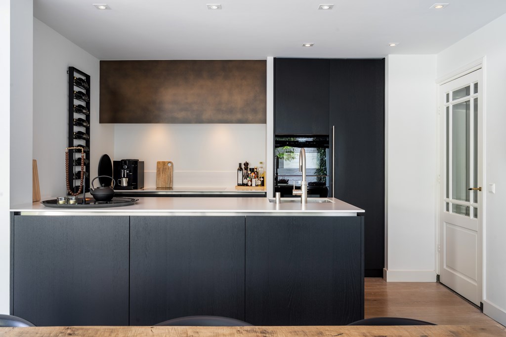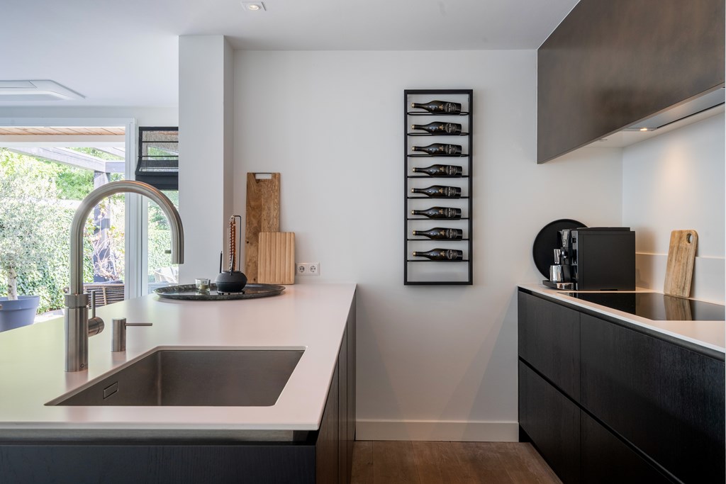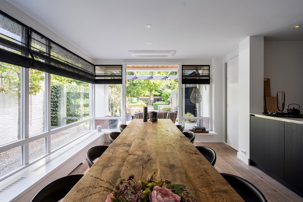 Aan de achterzijde bevindt zich de royale eethoek, voorzien van airconditioning, met directe toegang tot de moderne keuken. Deze is uitgerust met diverse hoogwaardige inbouwapparatuur, waaronder een Miele stoomoven en tweede oven, inductiekookplaat, Quooker en een ruime Liebherr-koelkast. Aansluitend bevindt zich de bijkeuken met extra bergruimte, aansluitingen voor wasmachine en droger, en toegang tot de achtertuin.