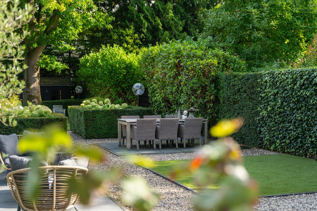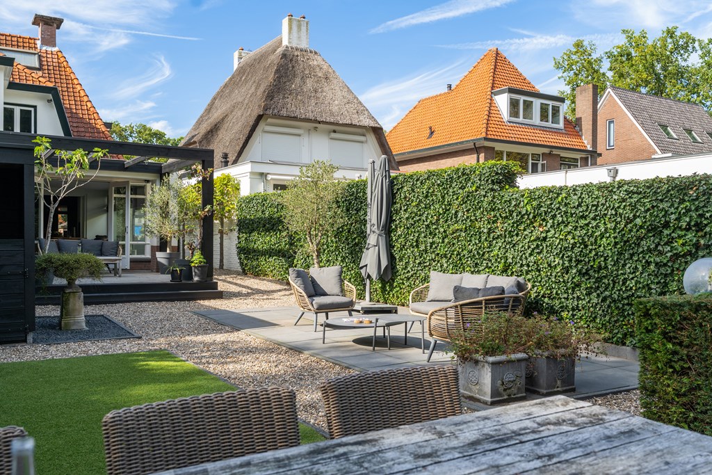 De achtertuin is verzorgd en royaal opgezet; een ideale plek voor gezinnen en liefhebbers van het buitenleven. Met een diepte van circa 45 meter biedt de tuin volop ruimte om te genieten van meerdere zithoeken, zowel in de zon als in de schaduw. De indeling is fraai en functioneel ingericht met kunstgras en kleurrijke bloemenperken, die zorgen voor een onderhoudsvriendelijke en sfeervolle uitstraling.
