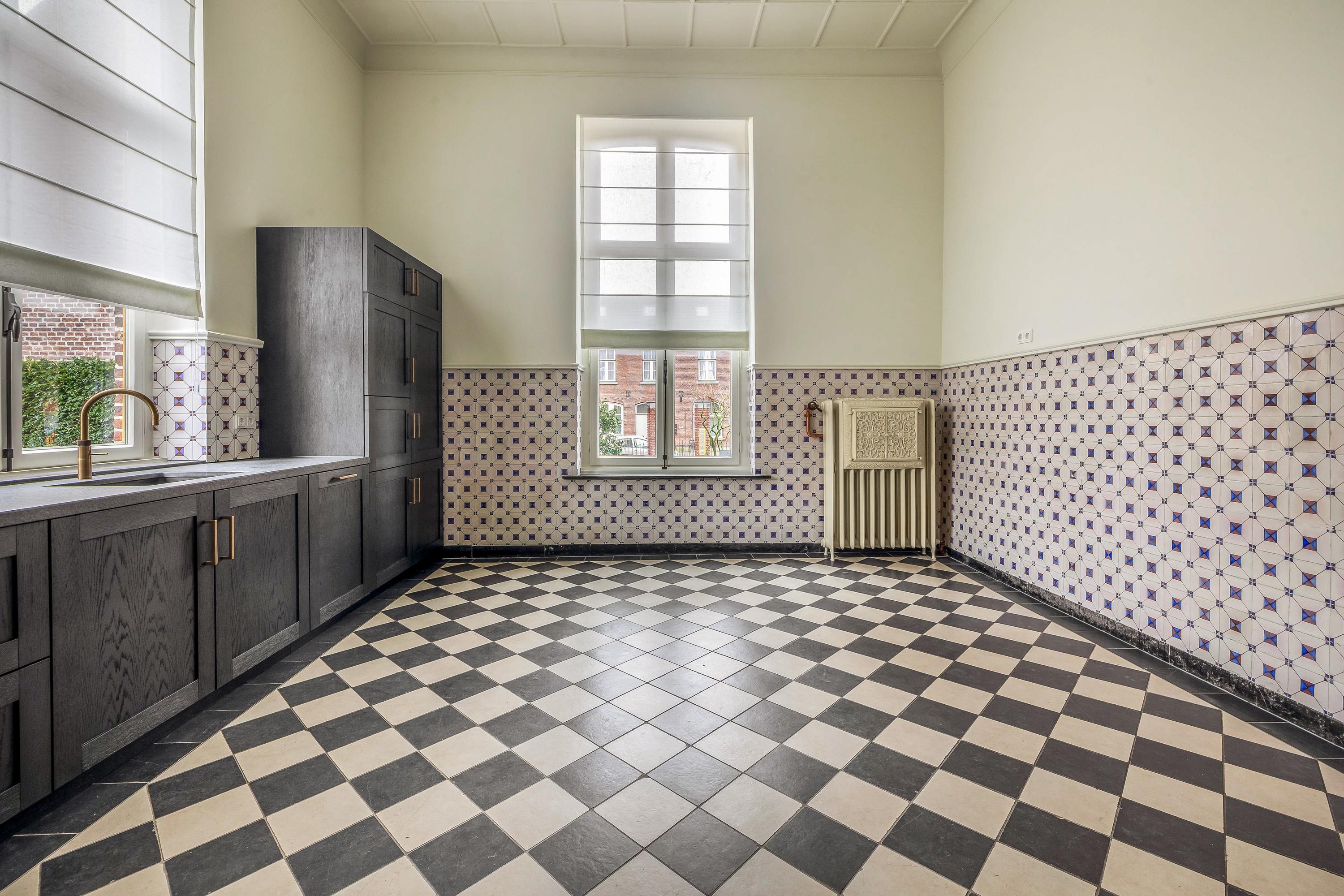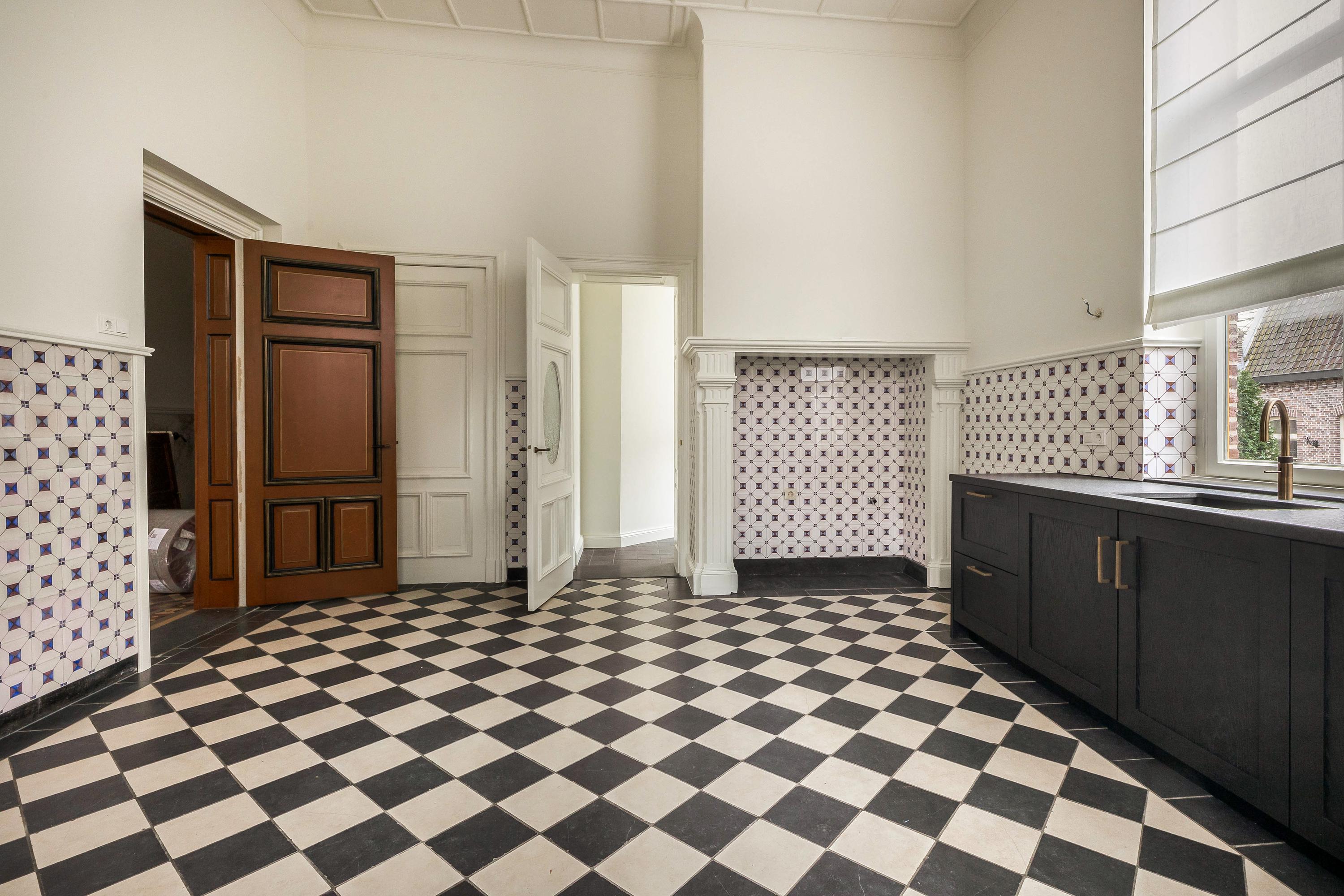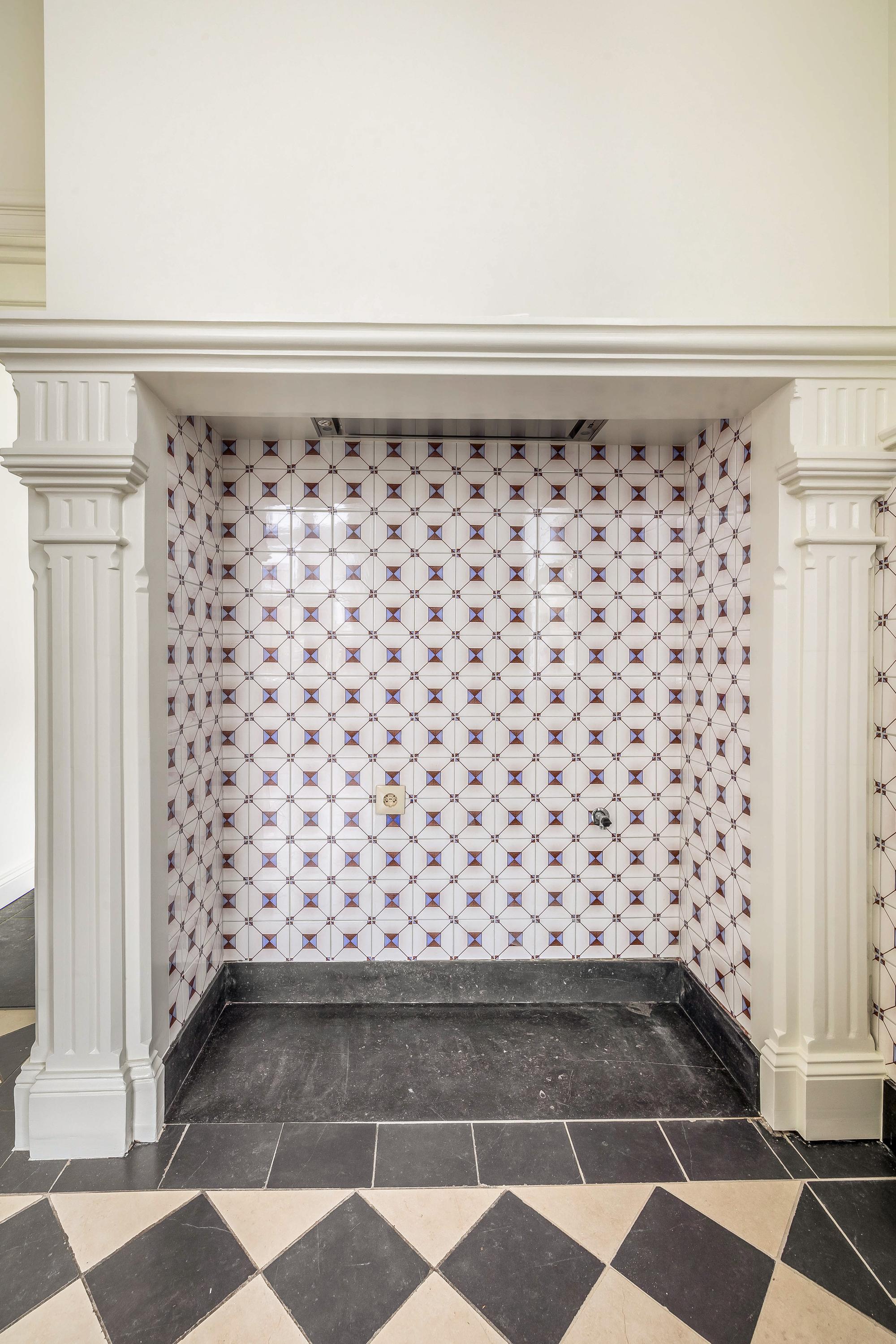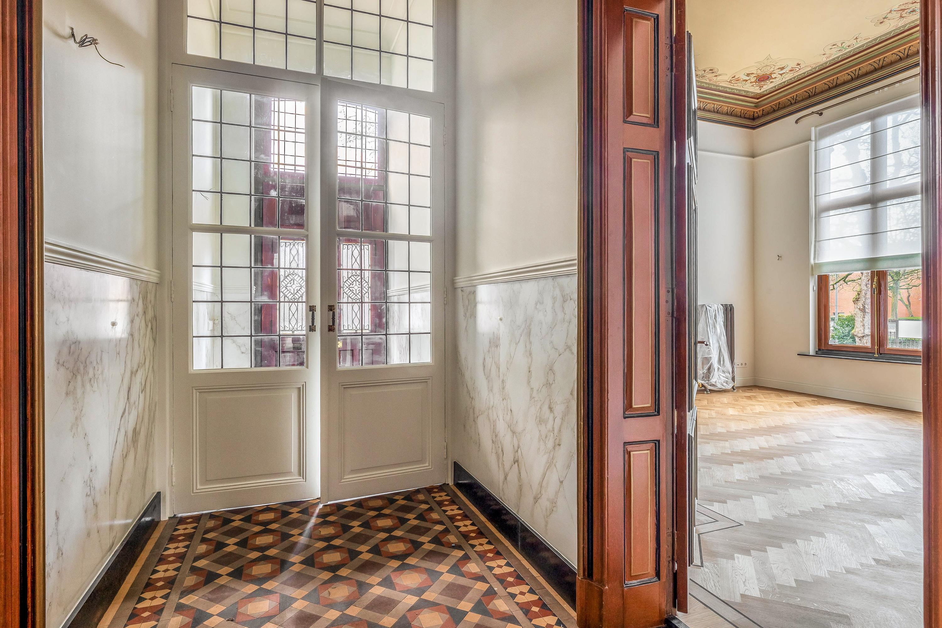 Via een eigen voordeur betreedt u de ruime ontvangsthal, die direct een gevoel van grandeur en elegantie oproept. De hoge plafonds zorgen voor een indrukwekkende ruimtelijkheid, terwijl de hoogwaardige afwerking met kwaliteitsmaterialen de exclusieve uitstraling van het appartement benadrukt. Vanuit de hal is de afzonderlijke, zeer royale, keuken toegankelijk welke is uitgevoerd met karakteristiek tegelwerk en voorzien van originele, historische details die het monumentale karakter van het pand tot zijn recht laat komen. Aangrenzend aan de keuken bevindt zich de bijkeuken. Deze is uitgerust met een wastafel en de benodigde aansluitingen voor het witgoed. In de hal is tevens een stijlvol separaat toilet gesitueerd.