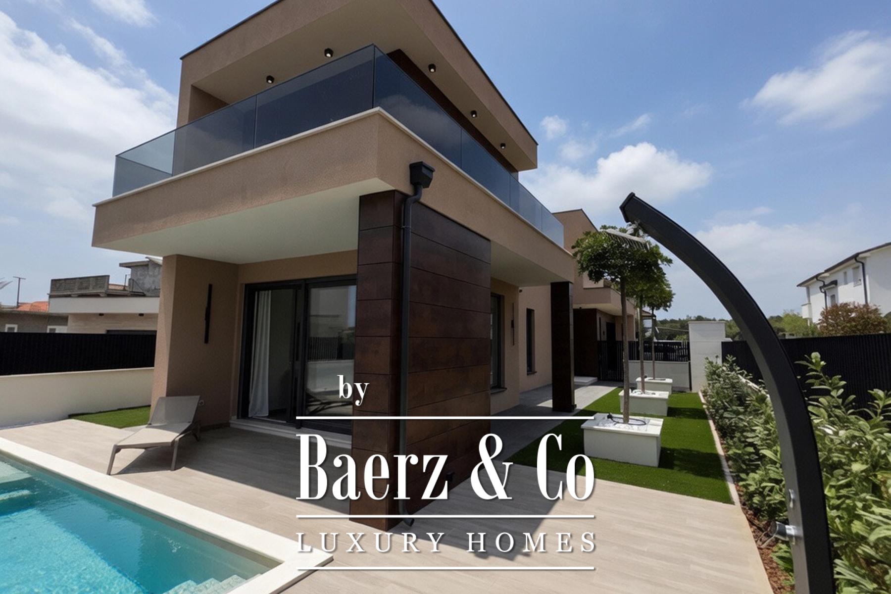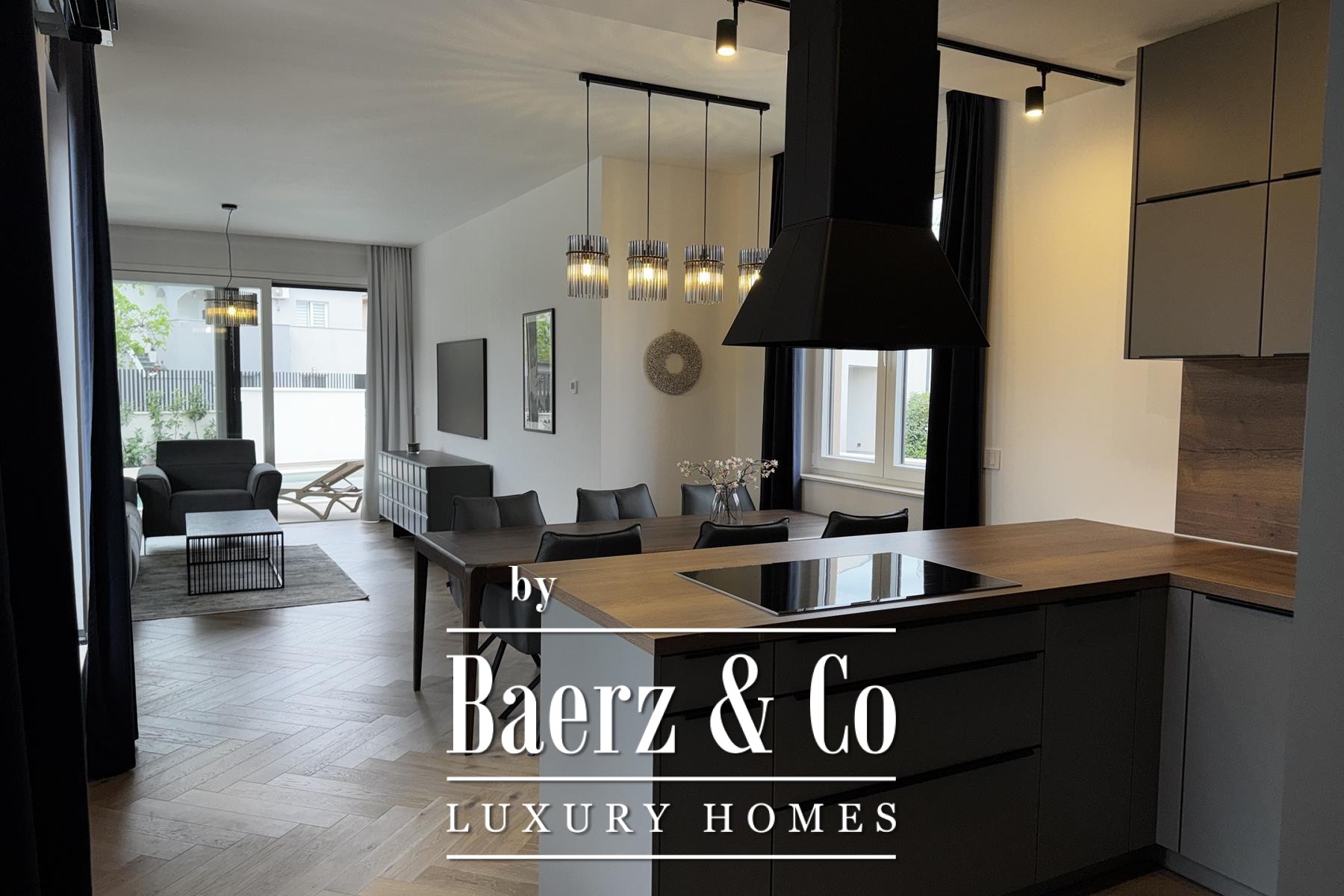 De villa is verdeeld over twee etages en omvat een open keuken met eetgedeelte, een royale woonkamer die uitkomt op een fraai aangelegde tuin met verwarmd zwembad en buitendouche. Op de begane grond bevinden zich tevens een gastentoilet met wasruimte, een berging en directe toegang tot de garage. Het focuszoekwoord "luxe villa Vodice" vat de essentie van dit aanbod samen door tijdloos design en intelligente systemen te combineren.
