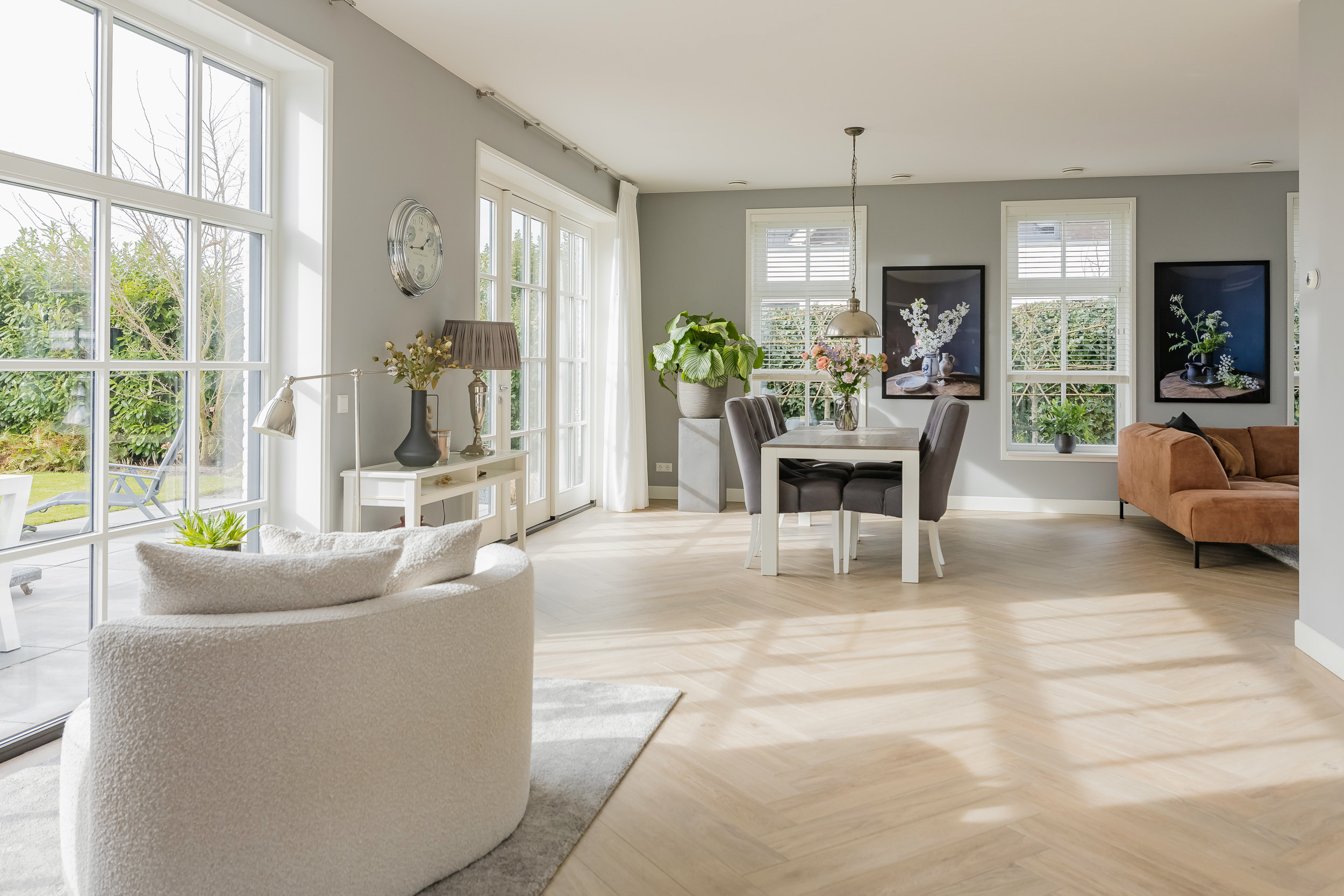 De woonkamer is ruim en licht dankzij de grote ramen met witte roedeverdeling en openslaande deuren naar het terras en de tuin rondom. Op de grond ligt een stijlvolle lichte tegelvloer. Aan de achterzijde geniet je van een fantastisch vrij uitzicht over de bollenvelden.