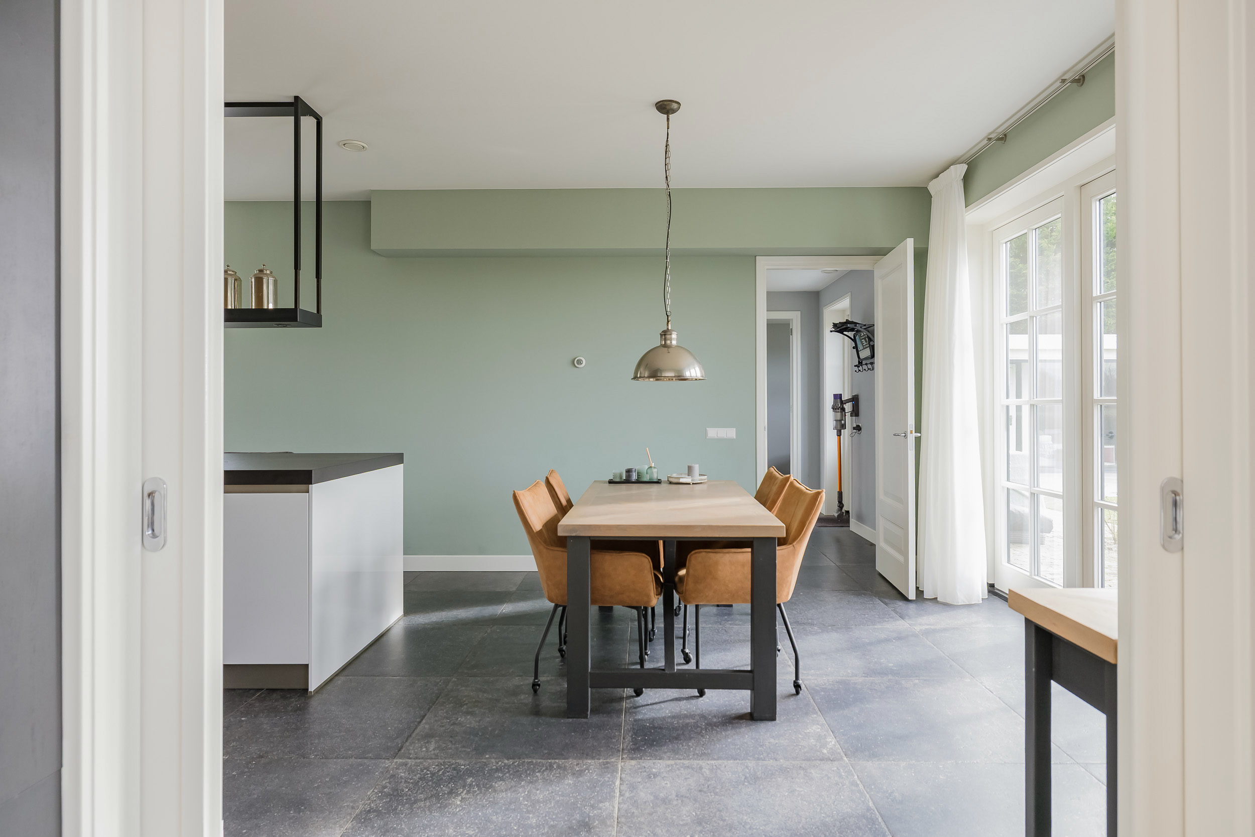 Via schuifdeuren bereik je de prachtige woonkeuken met kookeiland. Aansluitend vind je de bijkeuken met opstelling voor wasapparatuur en een deur naar de kantoorruimte op de begane grond: ideaal voor werken aan huis.