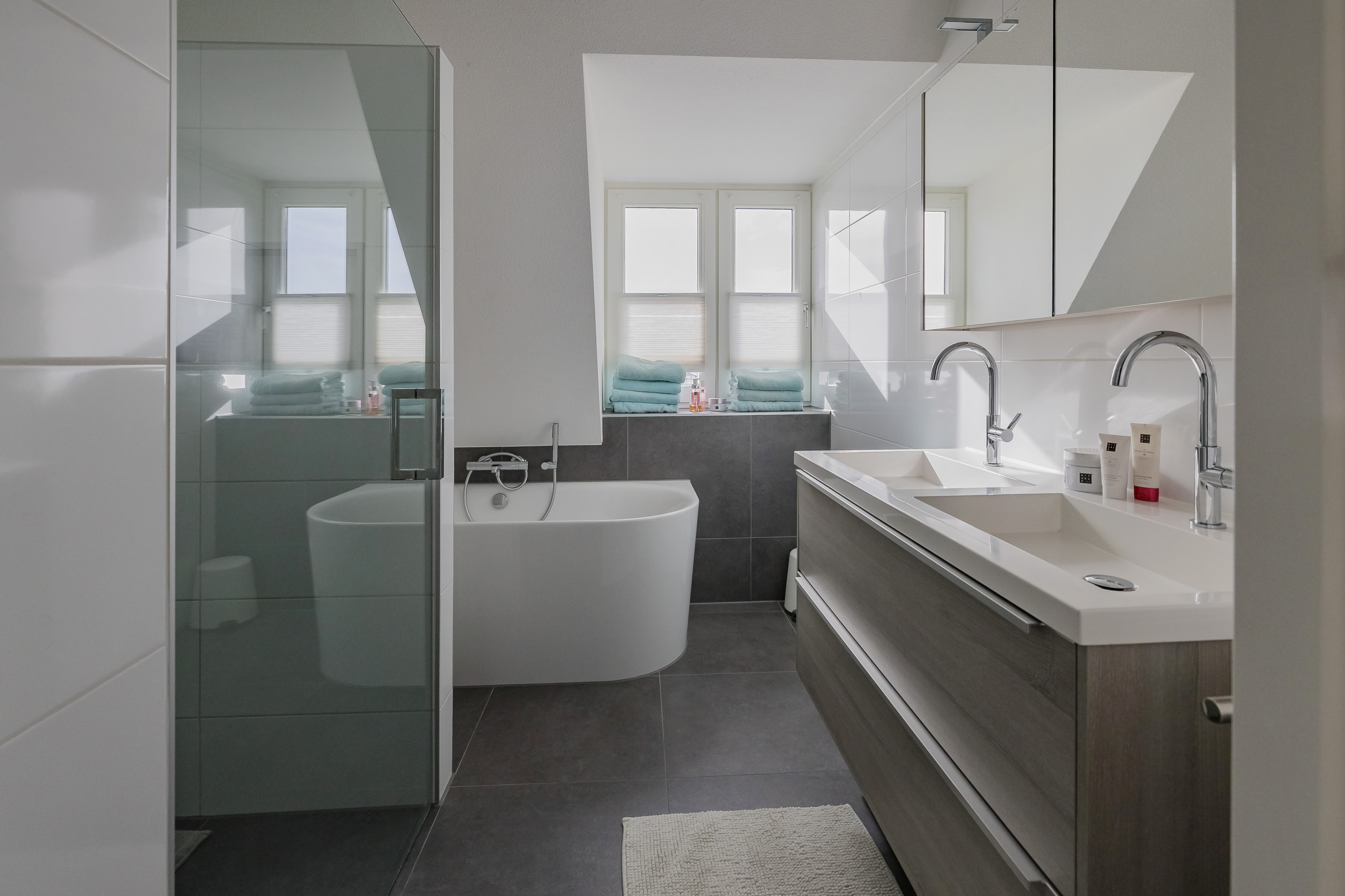 • Een luxe badkamer met ligbad, inloopdouche en dubbele wastafel