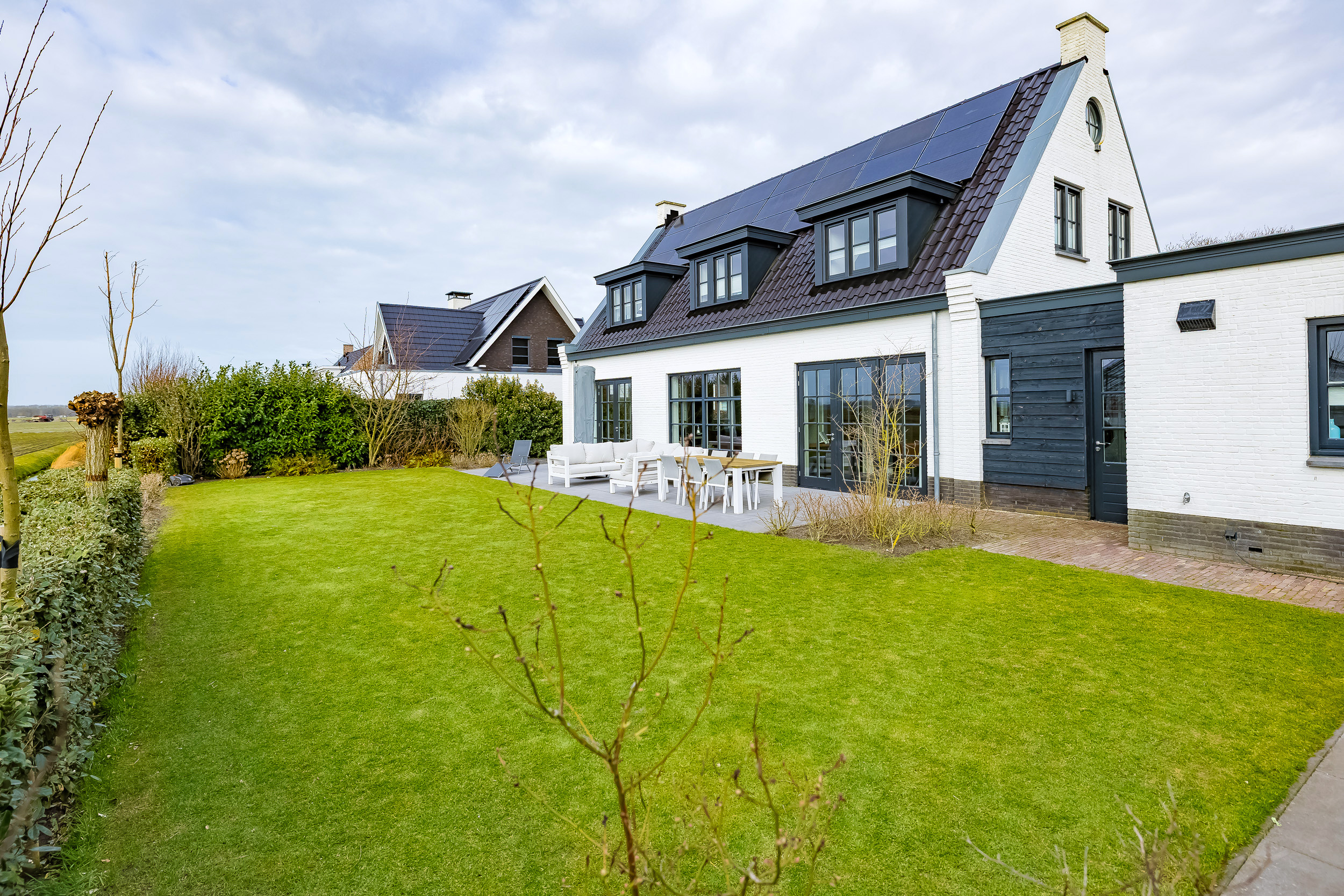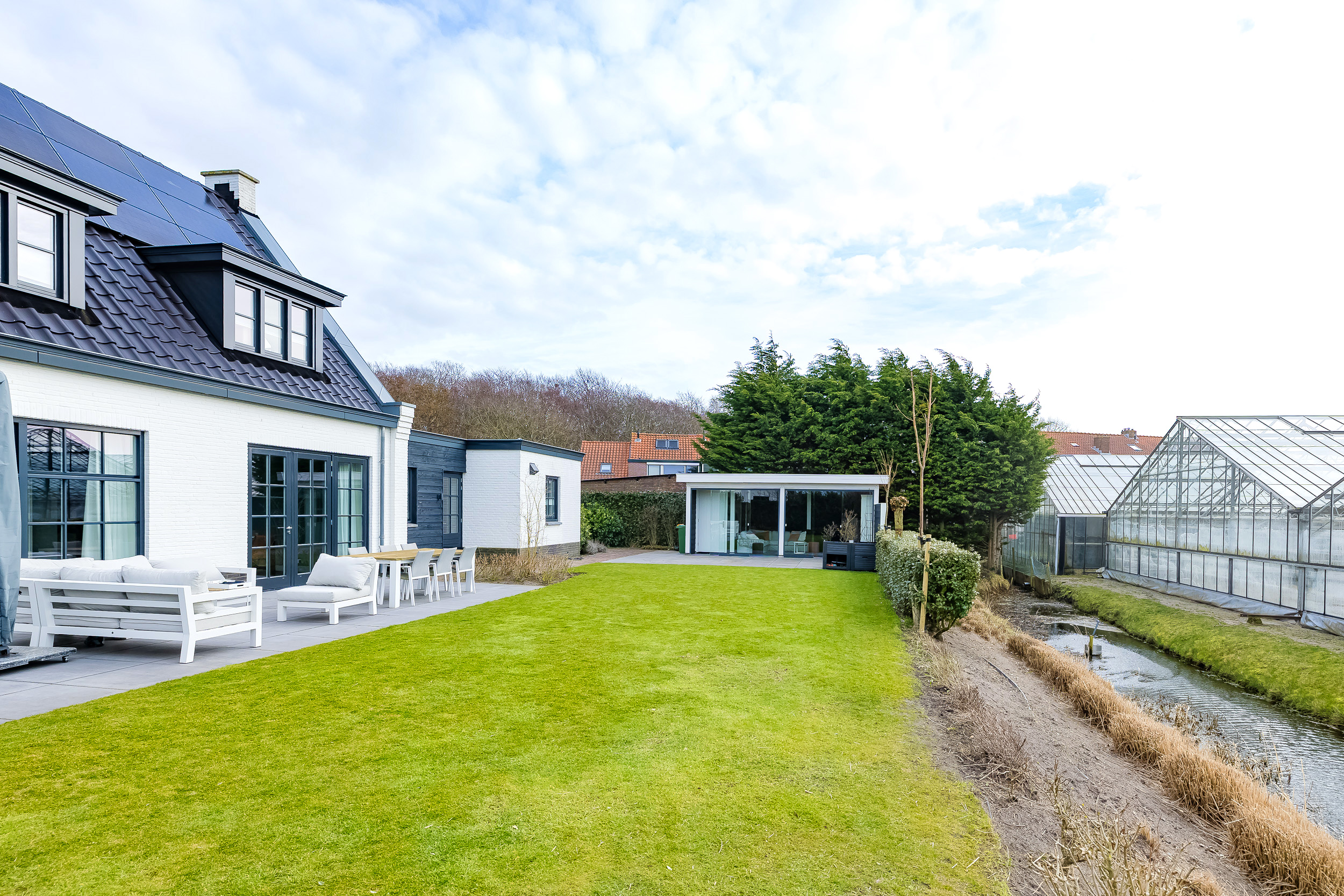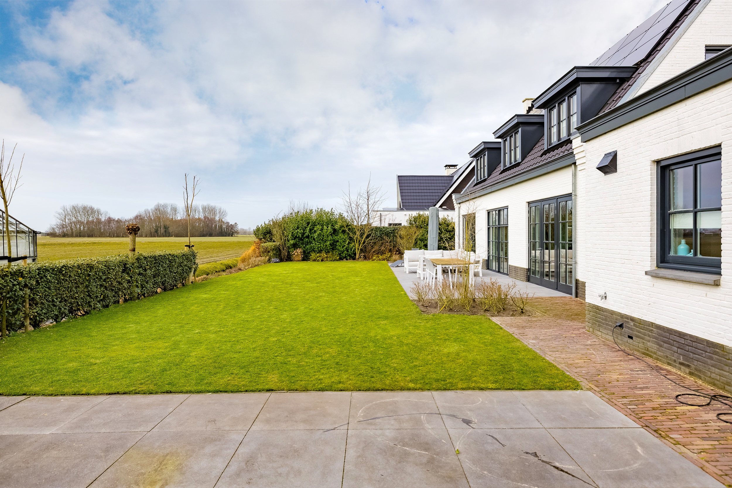 De tuin ligt rondom de woning en biedt altijd wel een zonnig plekje. Achter de woonkamer ligt een groot betegeld terras met een fenomenaal vrij uitzicht over de bollenvelden – hier geniet je elk seizoen van het landschap.