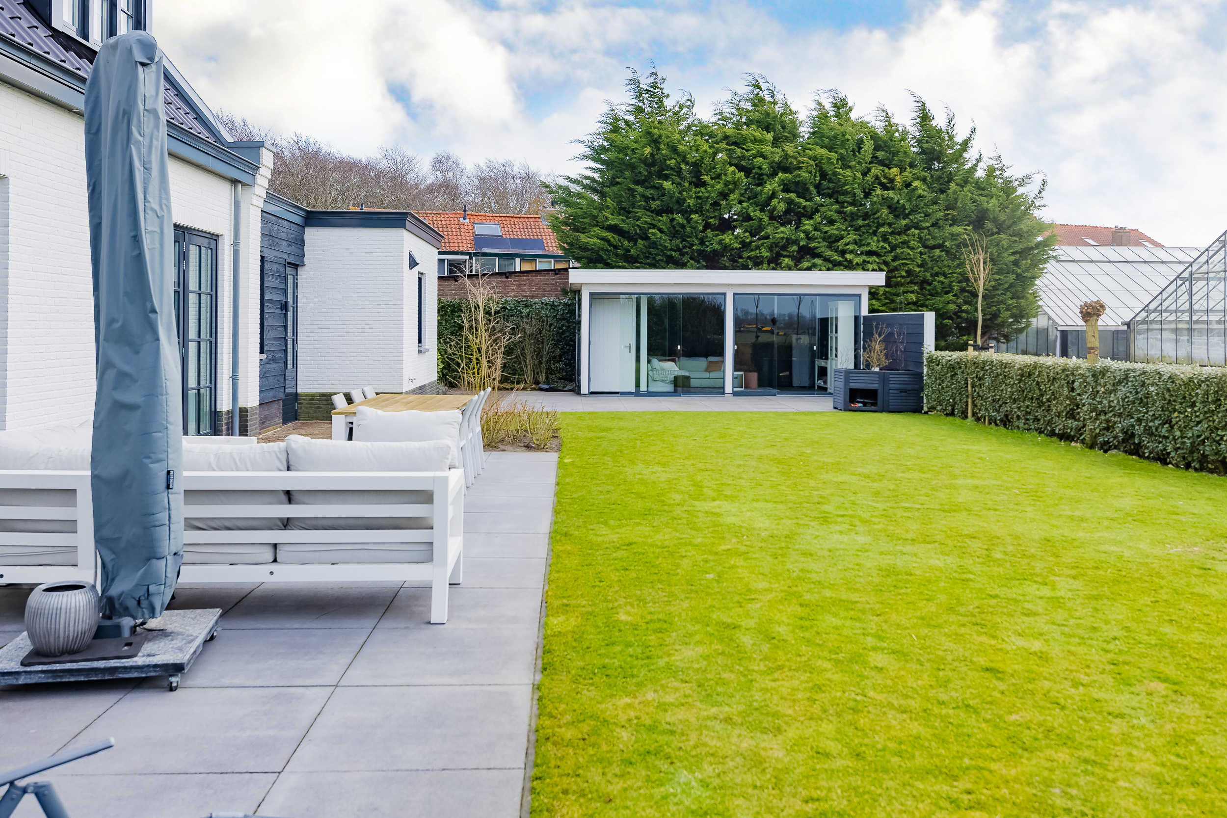 In de tuin staat bovendien een sfeervol tuinhuis met glazen deuren en een eigen terras: perfect als loungeplek, hobbyruimte of gastenverblijf.