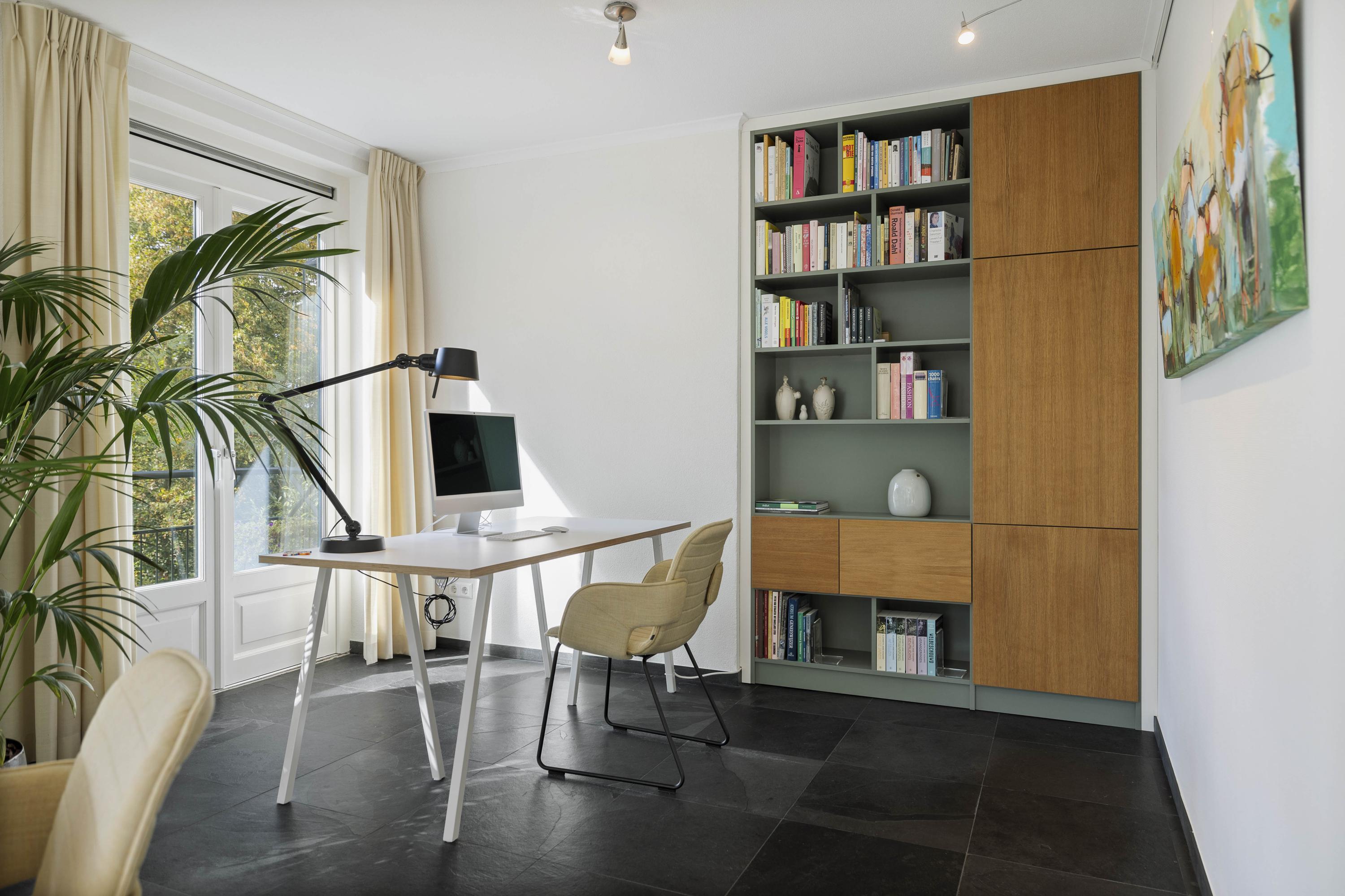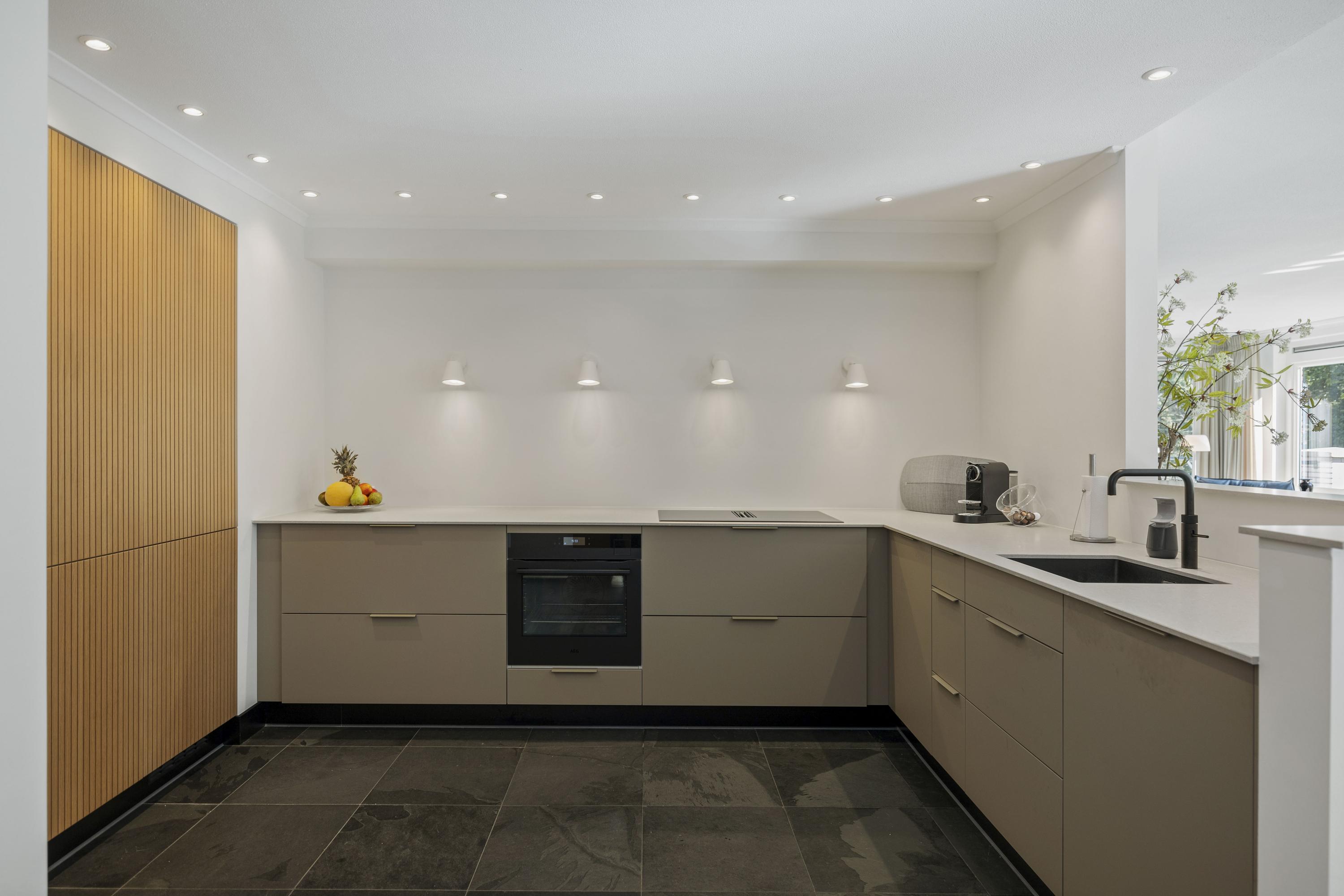 De moderne open keuken is voorzien van alle wenselijke inbouwapparatuur, waaronder een vaatwasser, hetelucht(stoom)oven, een inductiekookplaat met downdraft-afzuiging en een Quooker. Achter de wand met houten regels bevindt zich de koel/vriescombinatie en een royale hoeveelheid additionele bergruimte.