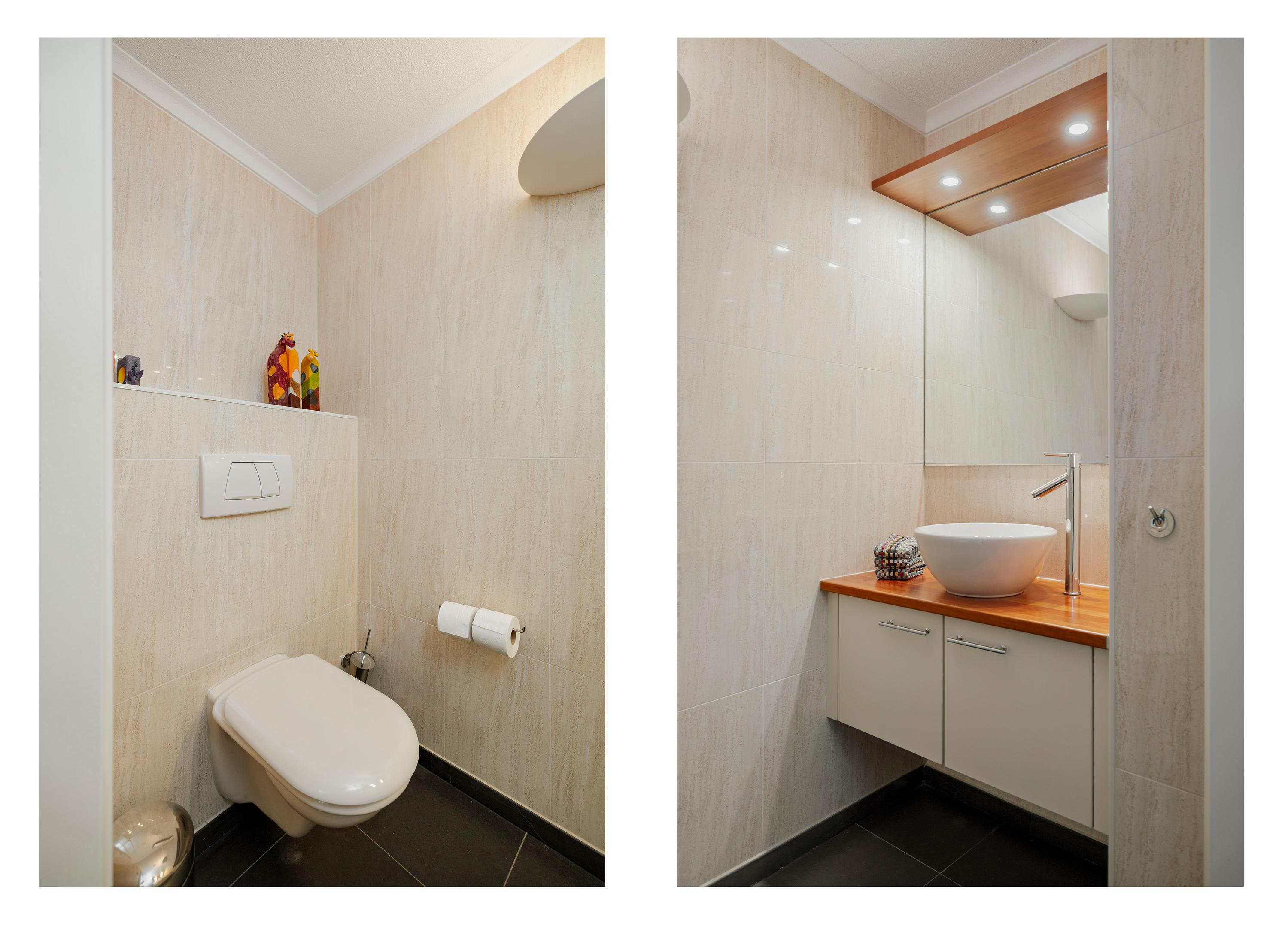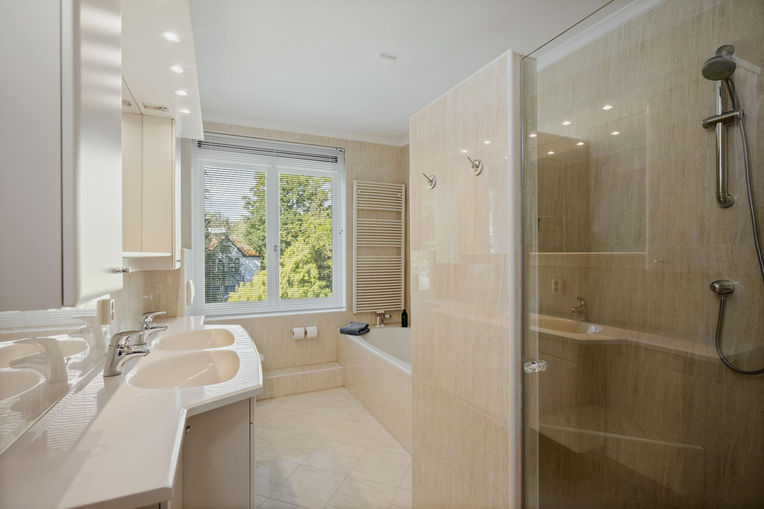 Openslaande deuren geven toegang tot de bijkeuken, twee slaap/hobby-kamers en een tweede badkamer met ligbad, inloopdouche en een dubbele wastafel. De ruime bijkeuken met spoelbak, cv installatie (2021), waterontharder en aansluitingen voor wasmachine en -droger heeft een eigen uitgang naar de entreehal met lift en trappenhuis.