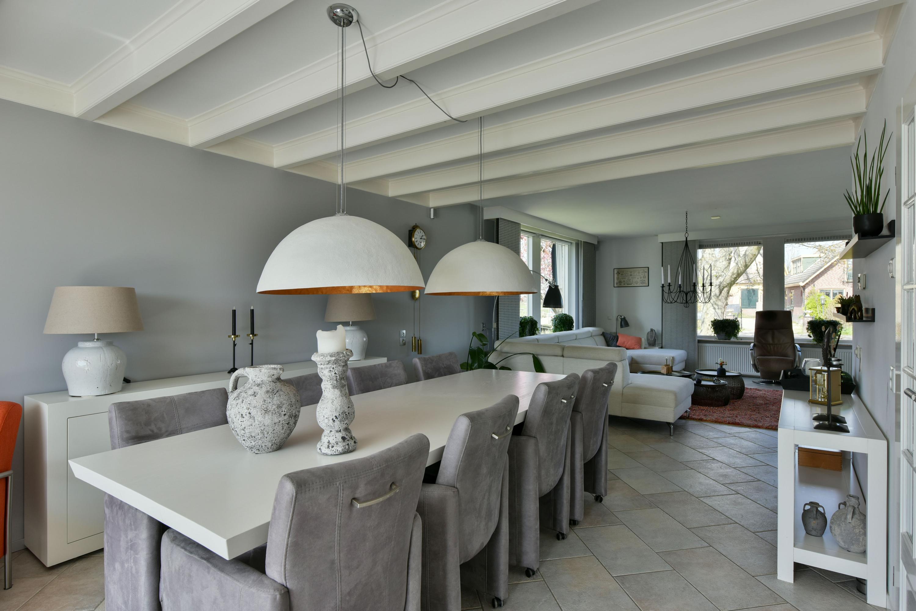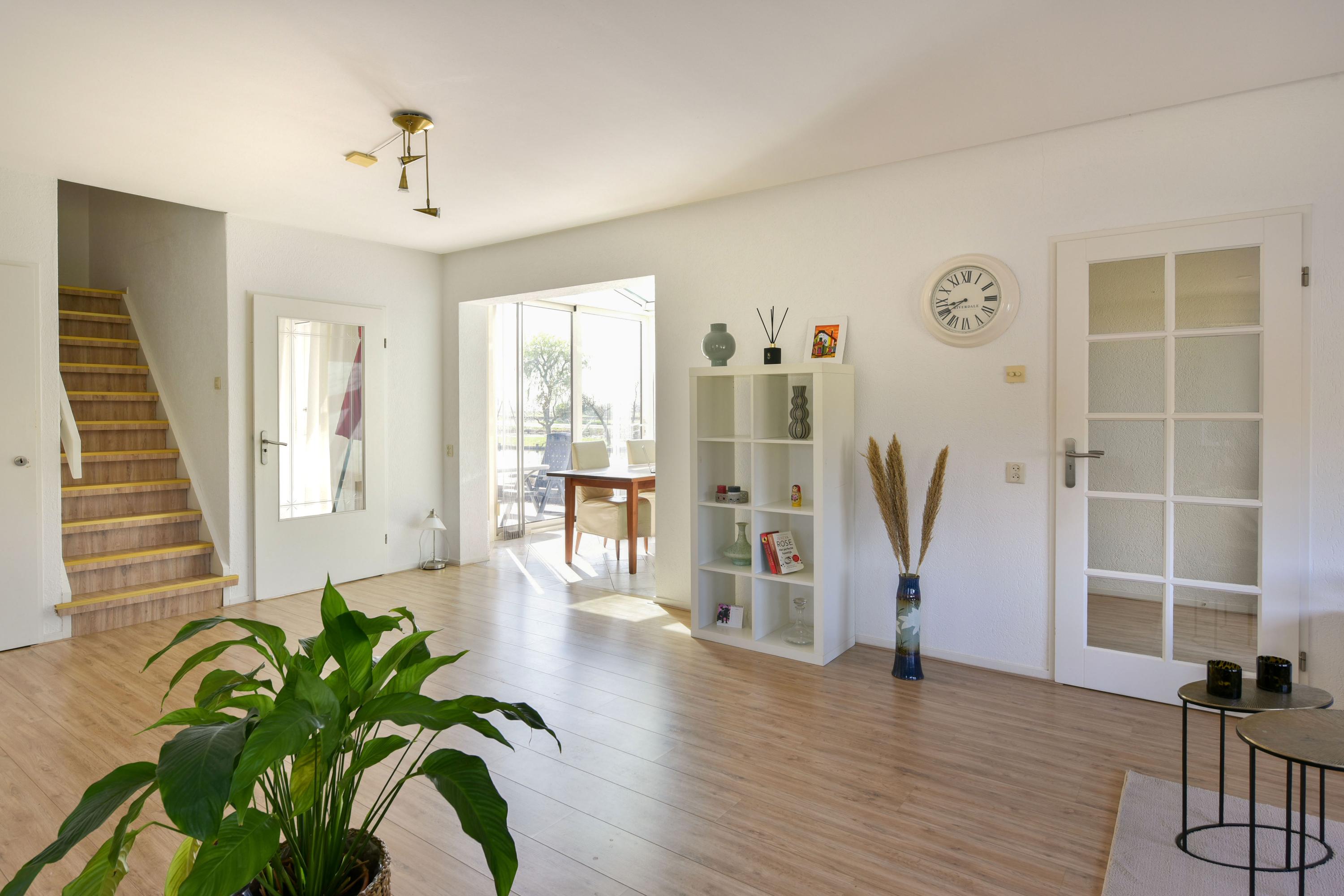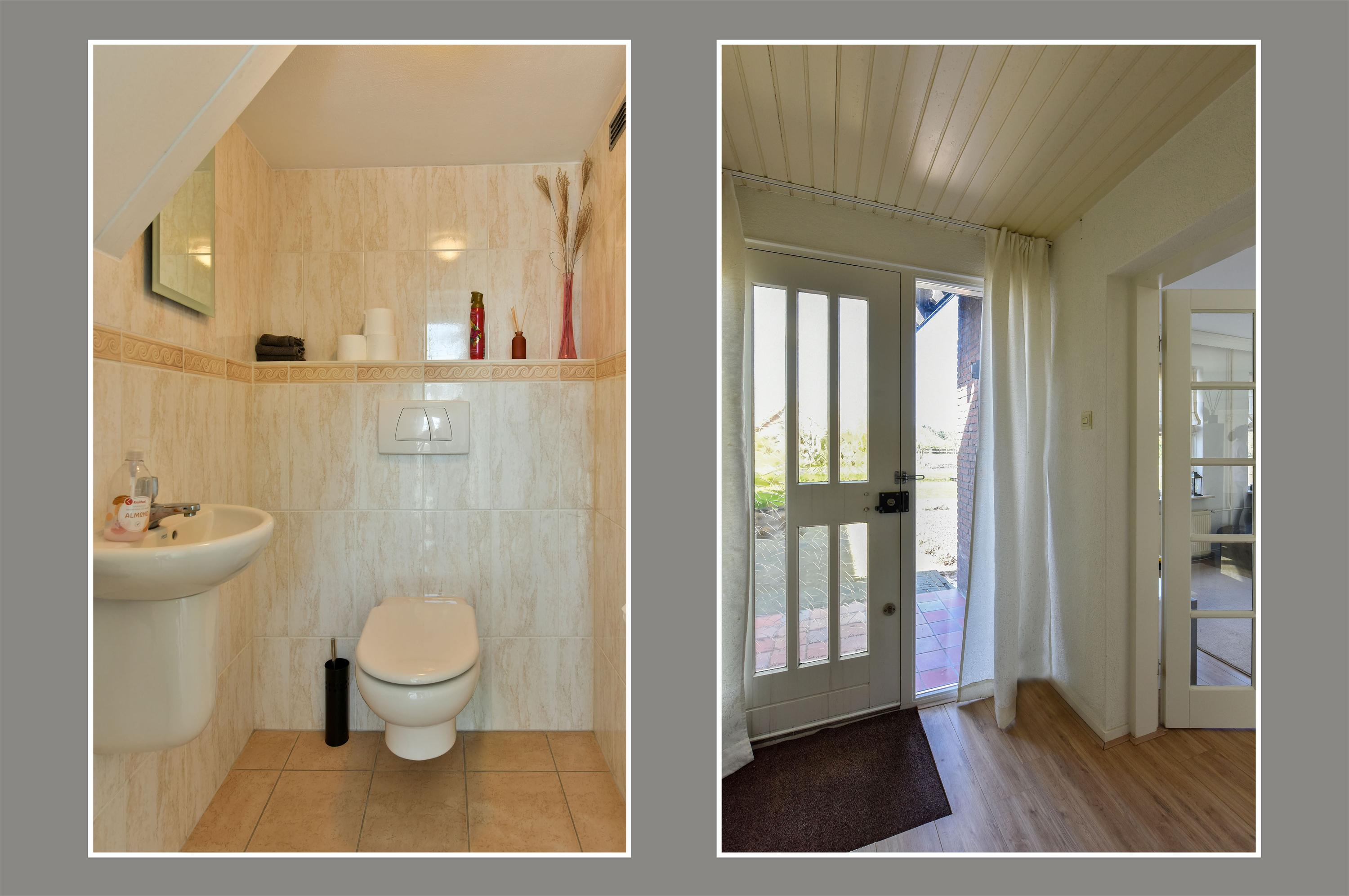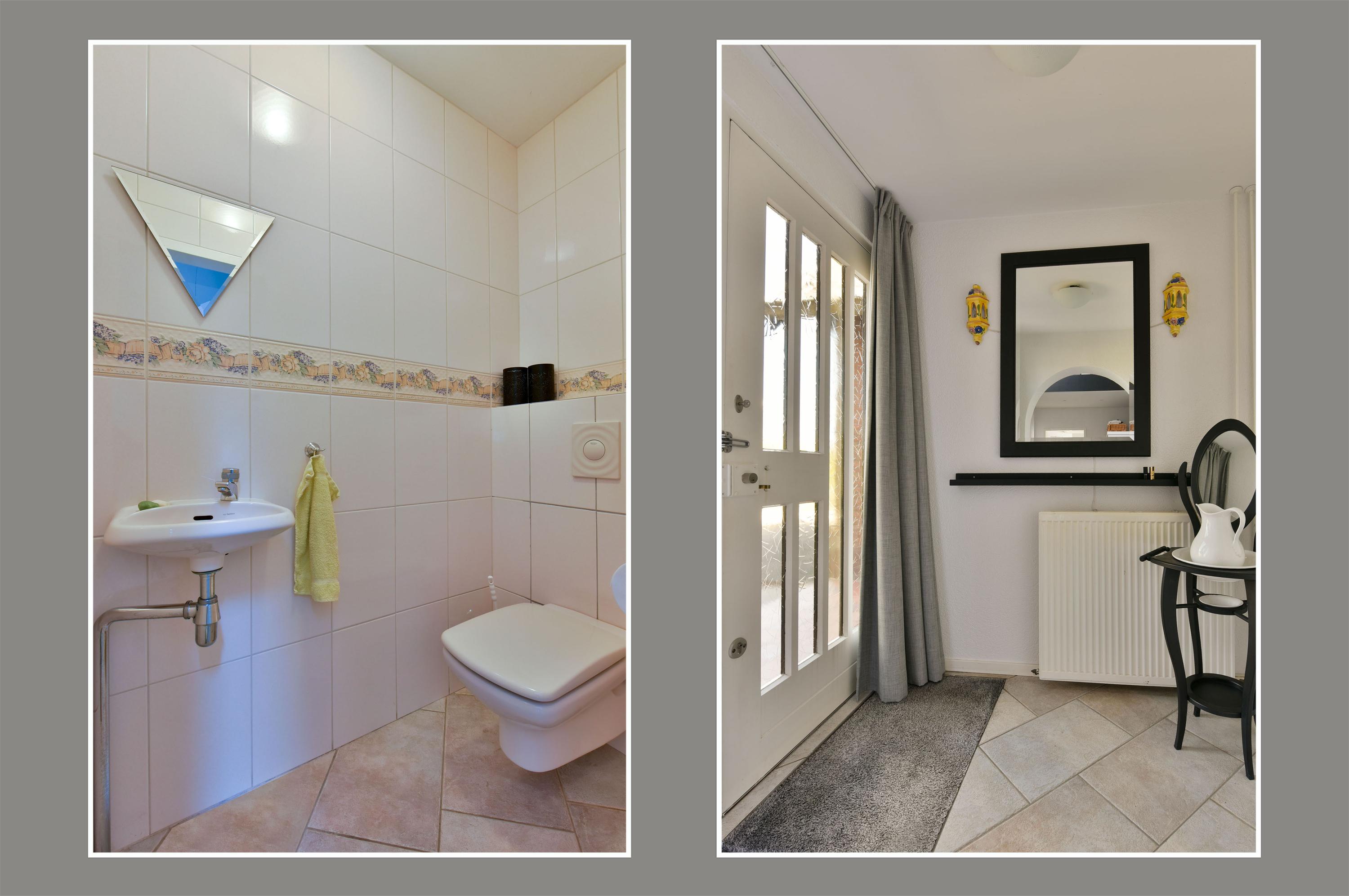 De tweede woning is net zo karaktervol, charmant en vol mogelijkheden. Ook hier word je verwelkomd door een ruime hal en een woonkamer met grote raampartijen, een sfeervolle gashaard en een warm houten laminaatvloer. De serre aan de achterzijde is een ware eyecatcher: licht, uitnodigend en met schuifpui naar de tuin. Een heerlijke plek om vier seizoenen lang te genieten van het uitzicht. De open keuken is praktisch en gezellig, met een inductiekookplaat, koelkast, vriezer, vaatwasser en combi-magnetronoven. Achterin de woning bevindt zich een ruime slaapkamer (nu in gebruik als inloopkast) met wastafel, naast een grote voorraadkast en het tweede toilet.