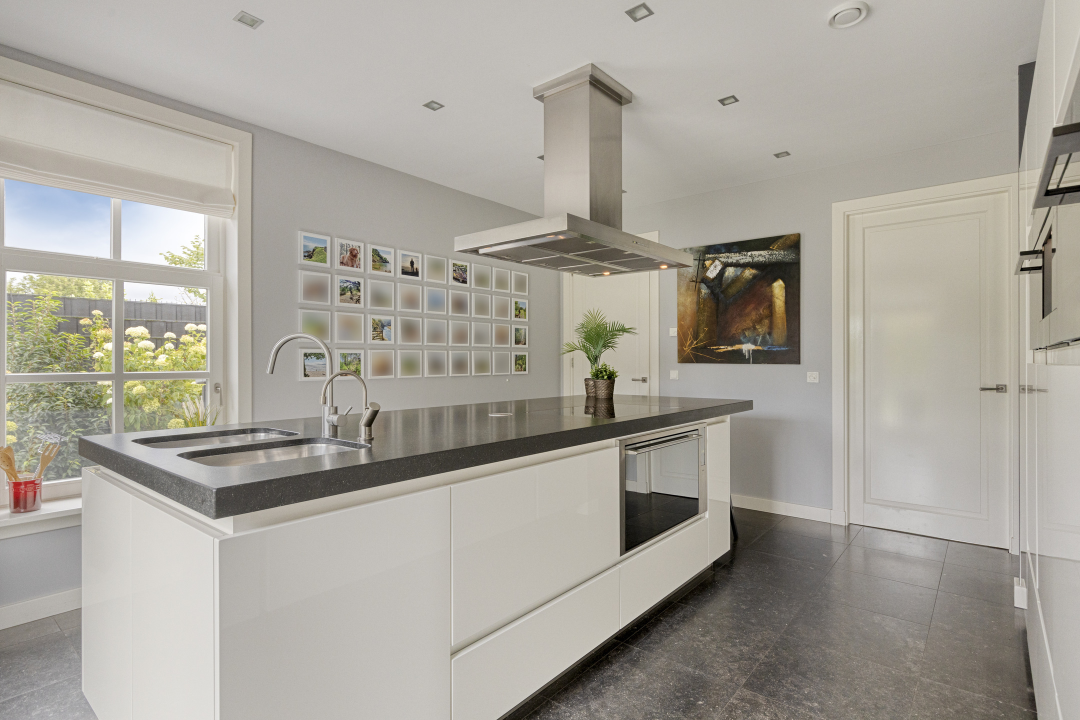Bijkeuken: wasmachine- en drogeraansluiting op ergonomische hoogte, praktische stortkoker voor de was vanuit de badkamer, wanden gestuct, natuurstenen vloer, plafond met inbouwspots, deur naar tuin/terras en deur naar de multifunctionele vleugel.