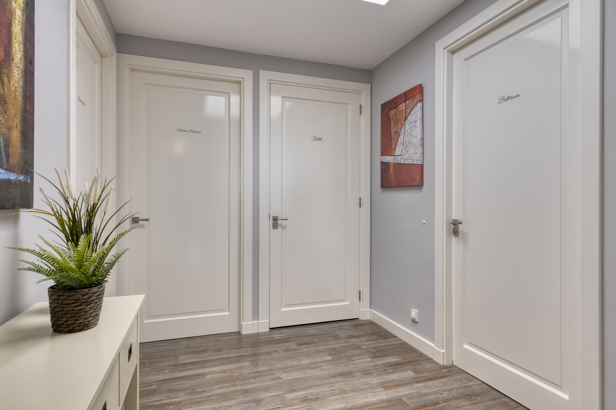 Op de verdieping bevinden zich vier slaapkamers, waaronder een ruime hoofdslaapkamer met inloopkast en luxe complete en-suite badkamer. Voor kinderen of gasten is er een tweede volwaardige badkamer en een separaat toilet. Een fraaie lichtkoepel voorziet de overloop van veel natuurlijk daglicht.