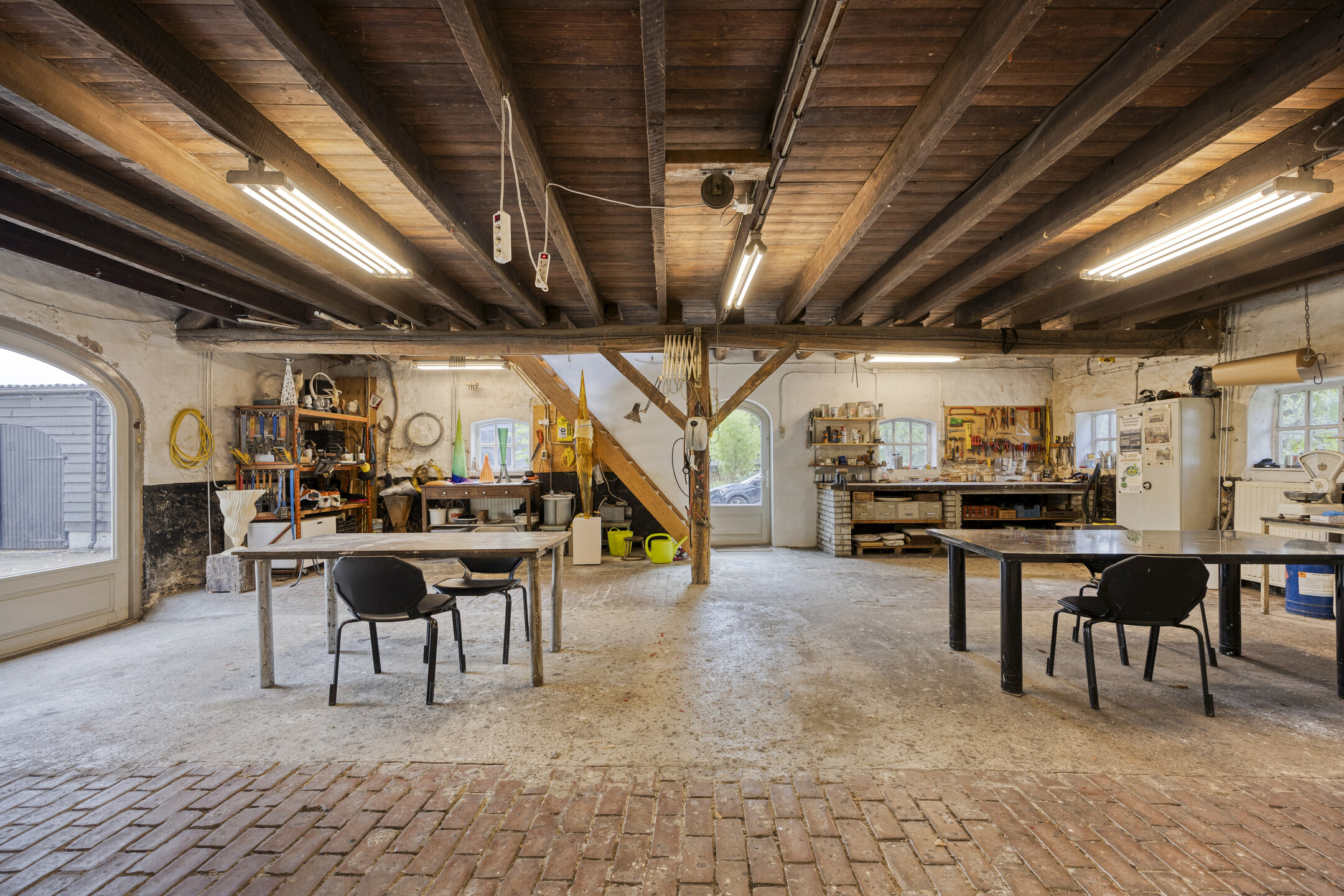 inpandig atelier als gesitueerd aan de voorzijde van de woonboerderij (ca. 87 m²), multifunctioneel in te richten / te gebruiken voor meerdere doeleinden, voorzien een keukenblok, een 2e trap naar de 1e verdieping, tuindeuren naar tuin/terras, loopdeur naar oprit, wandafwerking stucwerk, betonvloer en deels bestrating, balkenplafond.