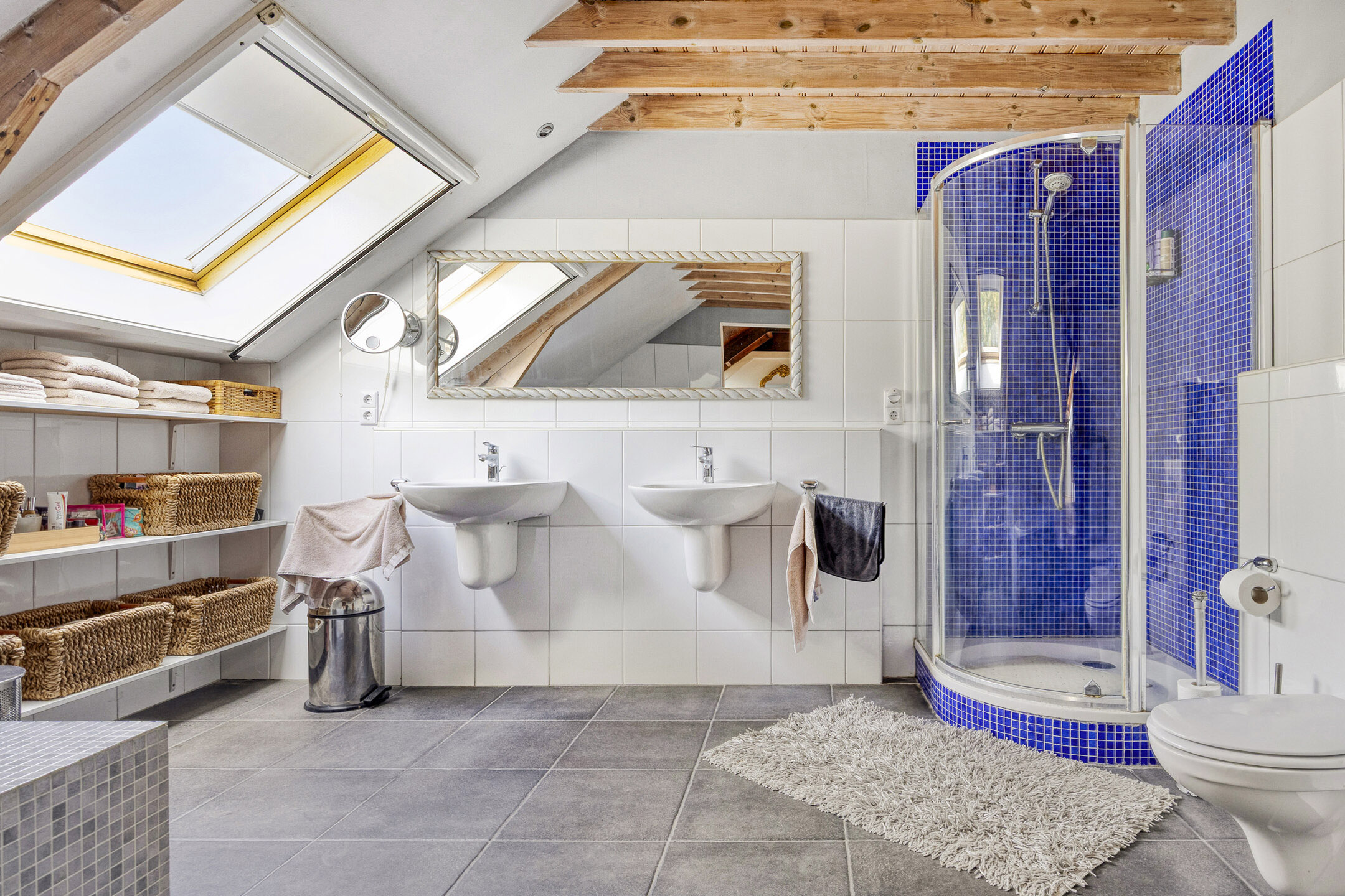 hoofdslaapkamer met een 3-tal dakramen, wandafwerking stucwerk, laminaatvloer met eiken bovenlaag, fraai zicht op de houten balkenconstructie, inloopkast vv. omvormer en een dakraam;