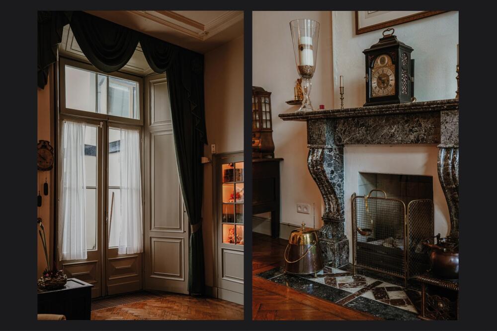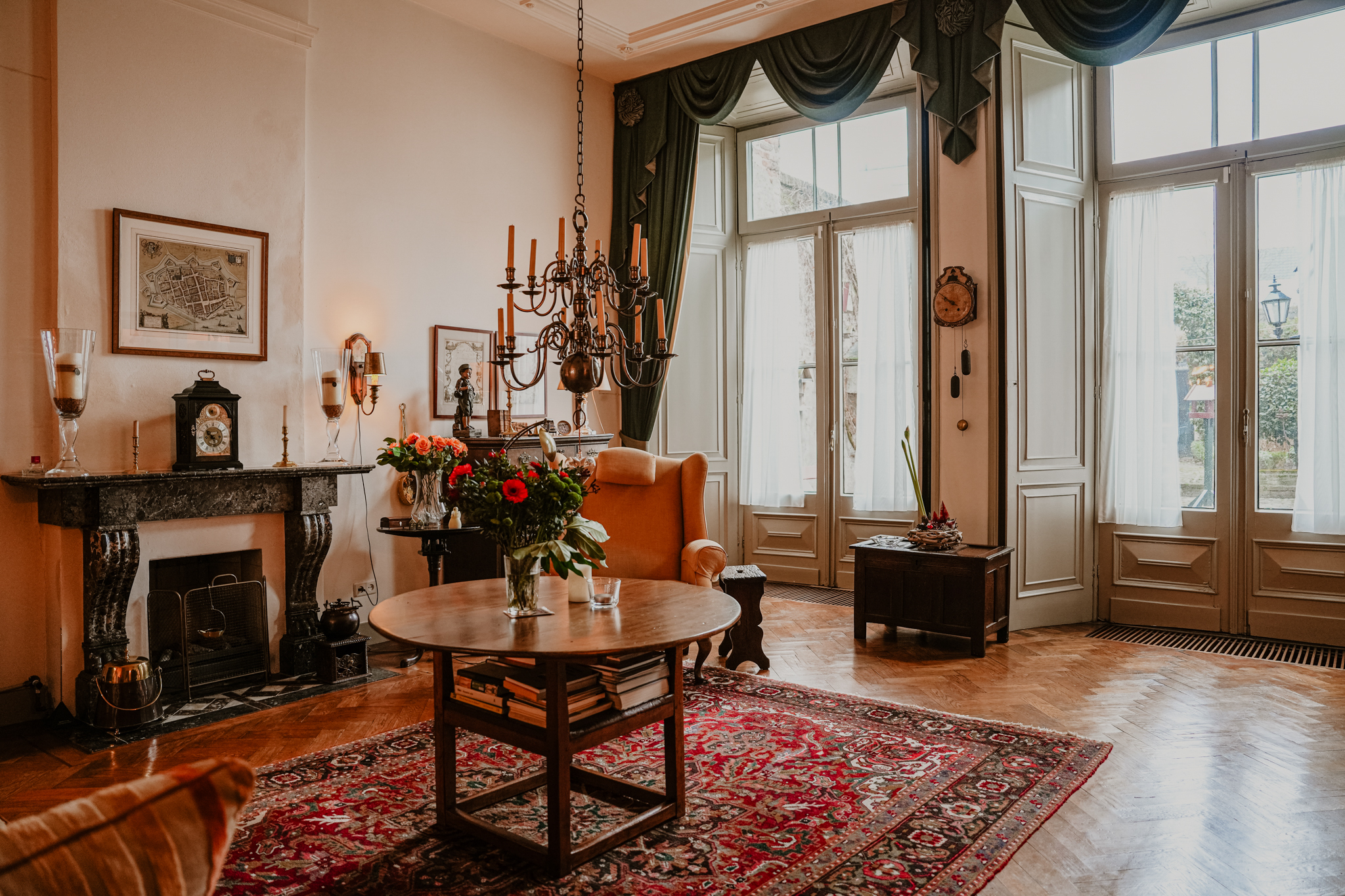 De woonkamer heeft hoge stucplafonds, hoge vensters met glas-in-lood bovenlichten, twee natuurstenen schouwen, zitvensterbanken, binnenluiken, vaste kasten en visgraatparket. Aan de achterzijde geven twee paar dubbele deuren toegang tot de tuin. Aan de eerdergenoemde gang grenzen een kelder, de bijkeuken en de eetkeuken. In de vloer van de kelder biedt een glasplaat zicht op de historische waterput. De bijkeuken bevindt zich op de plaats waar vroeger de buitenruimte van de westelijke woning was in de tijd dat het nog twee panden waren. In de gang zijn de 18e-eeuwse pomp met hardstenen spoelbak en koperen kranen nog aanwezig. De eetkeuken is ingericht met een klassiek keukenmeubel voorzien van enige inbouwapparatuur en een terrazzo-werkblad. Vanuit de keuken is zicht op de tuin.