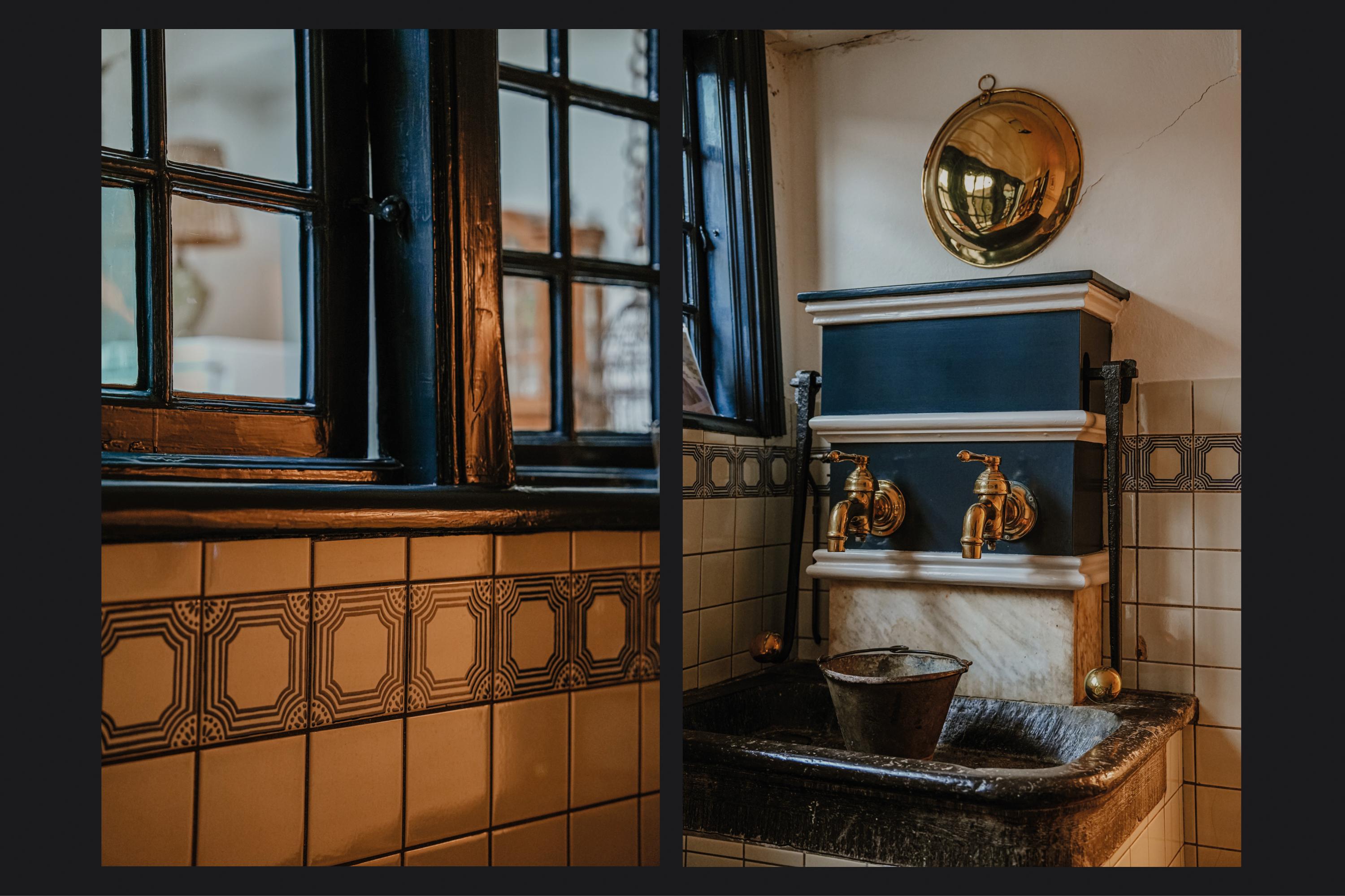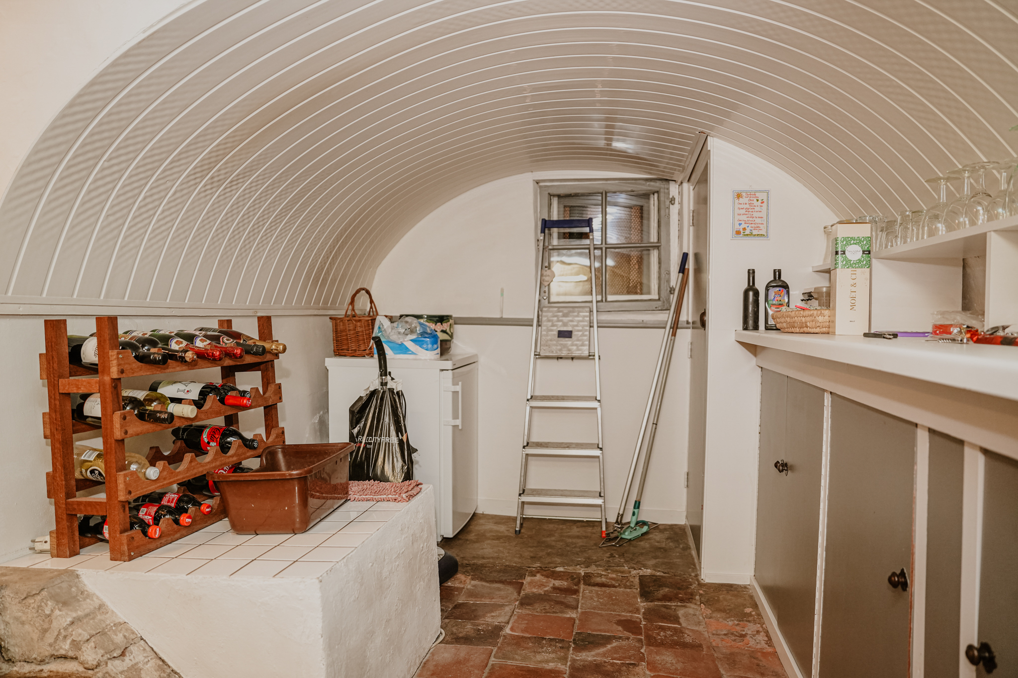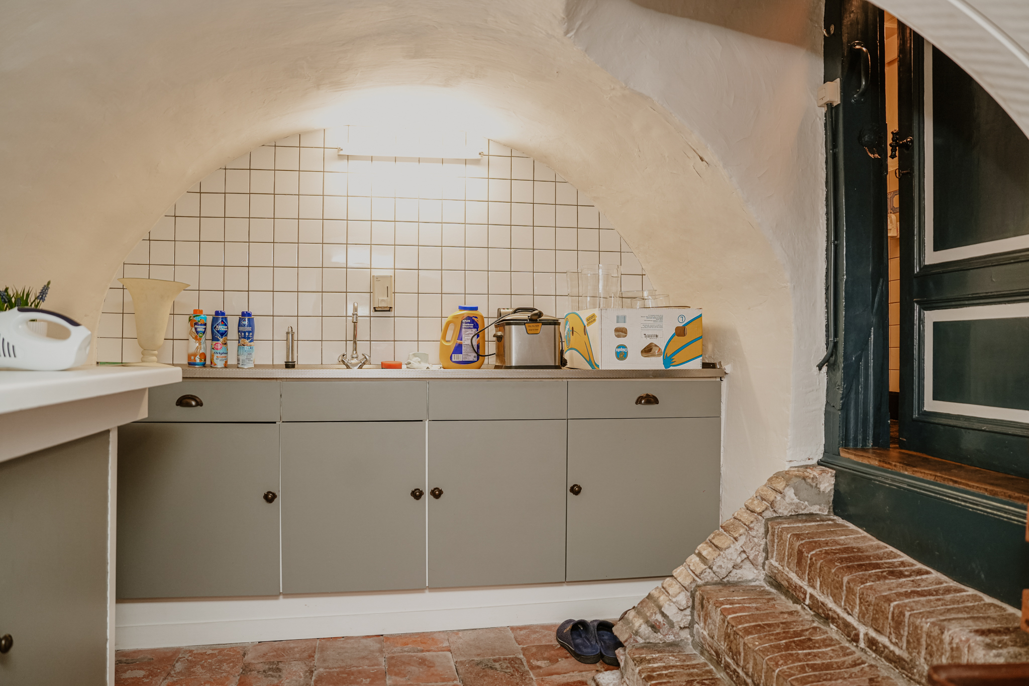 Dubbele middeleeuwse gewelfkelder onder het voor- en achterhuis.