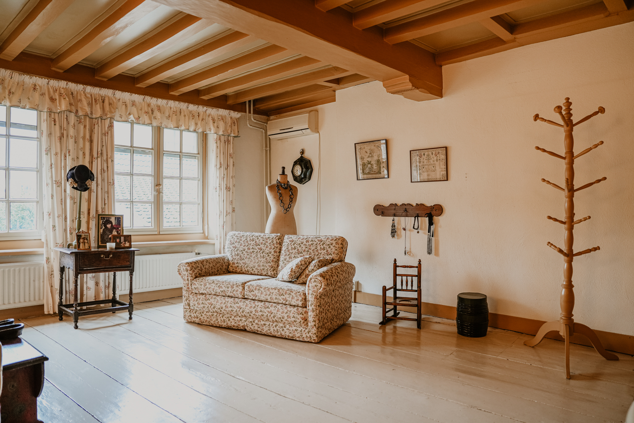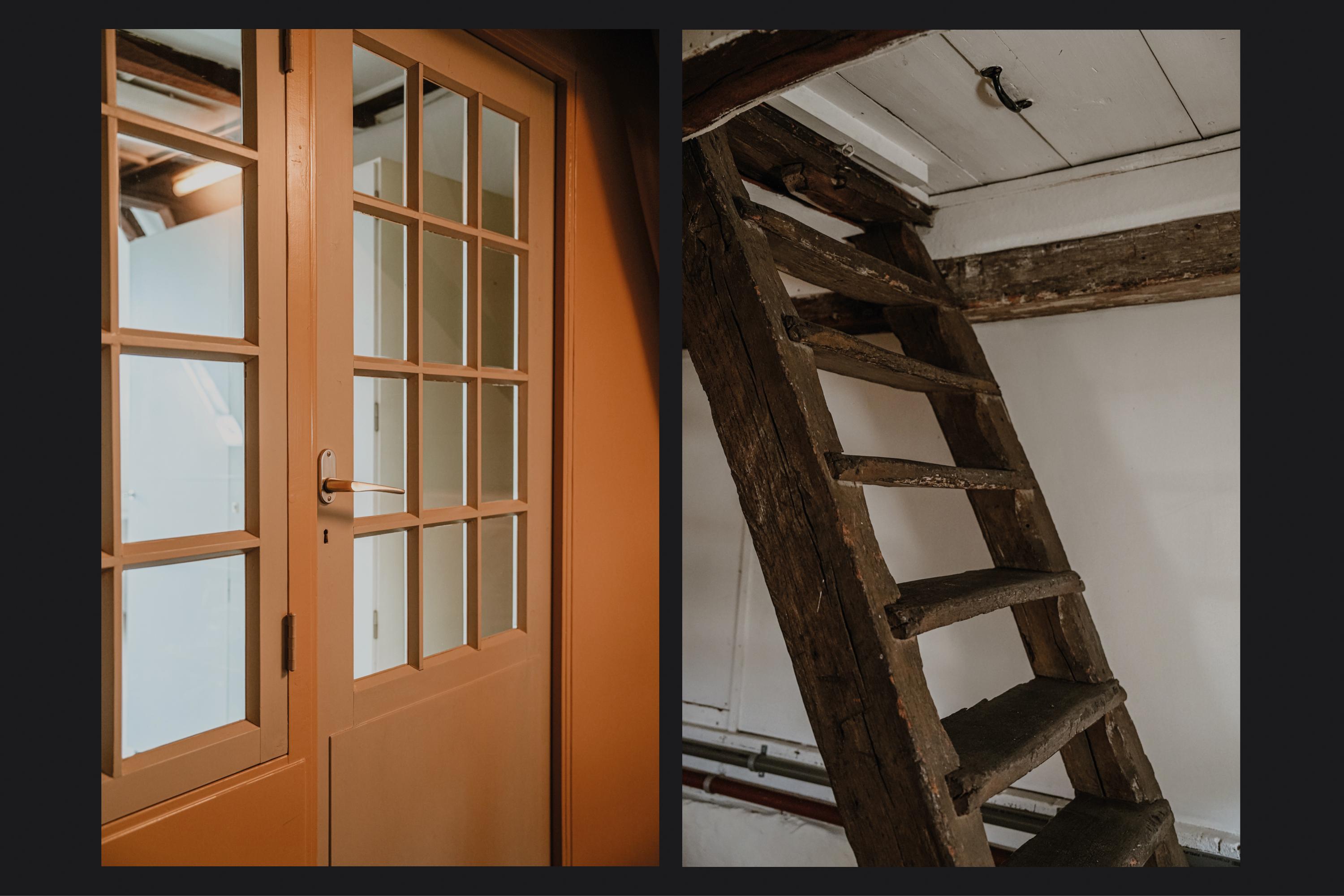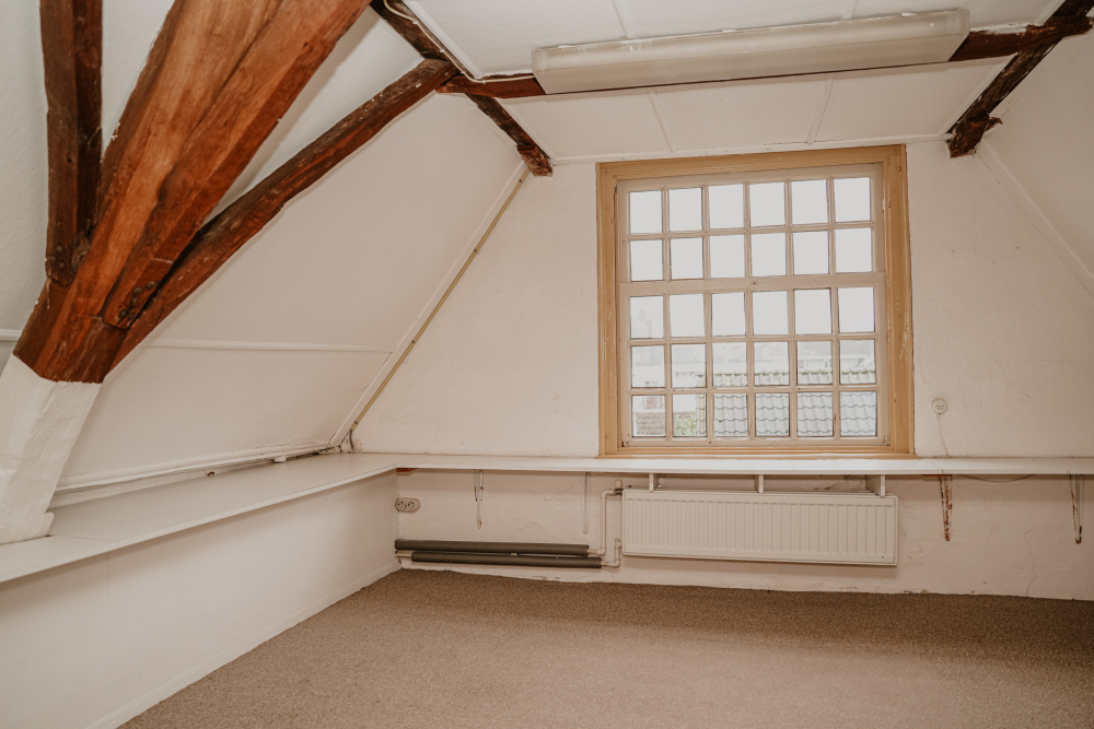Boven de keuken bevindt zich een werkkamer, bereikbaar via een vaste trap. Vanuit deze kamer is zicht op de achtergevel van het pand. Aan het trappenhuis grenst een sfeervolle slaap-/werkkamer met visgraatparket en houten lambrisering. Er zijn twee 24-ruits schuifvensters, vanwaar zicht is op de werkkamer boven de keuken.