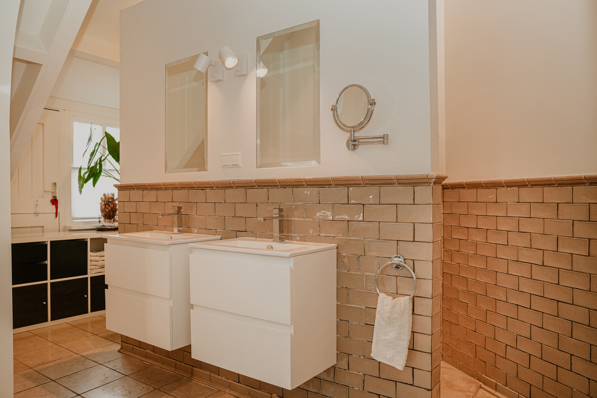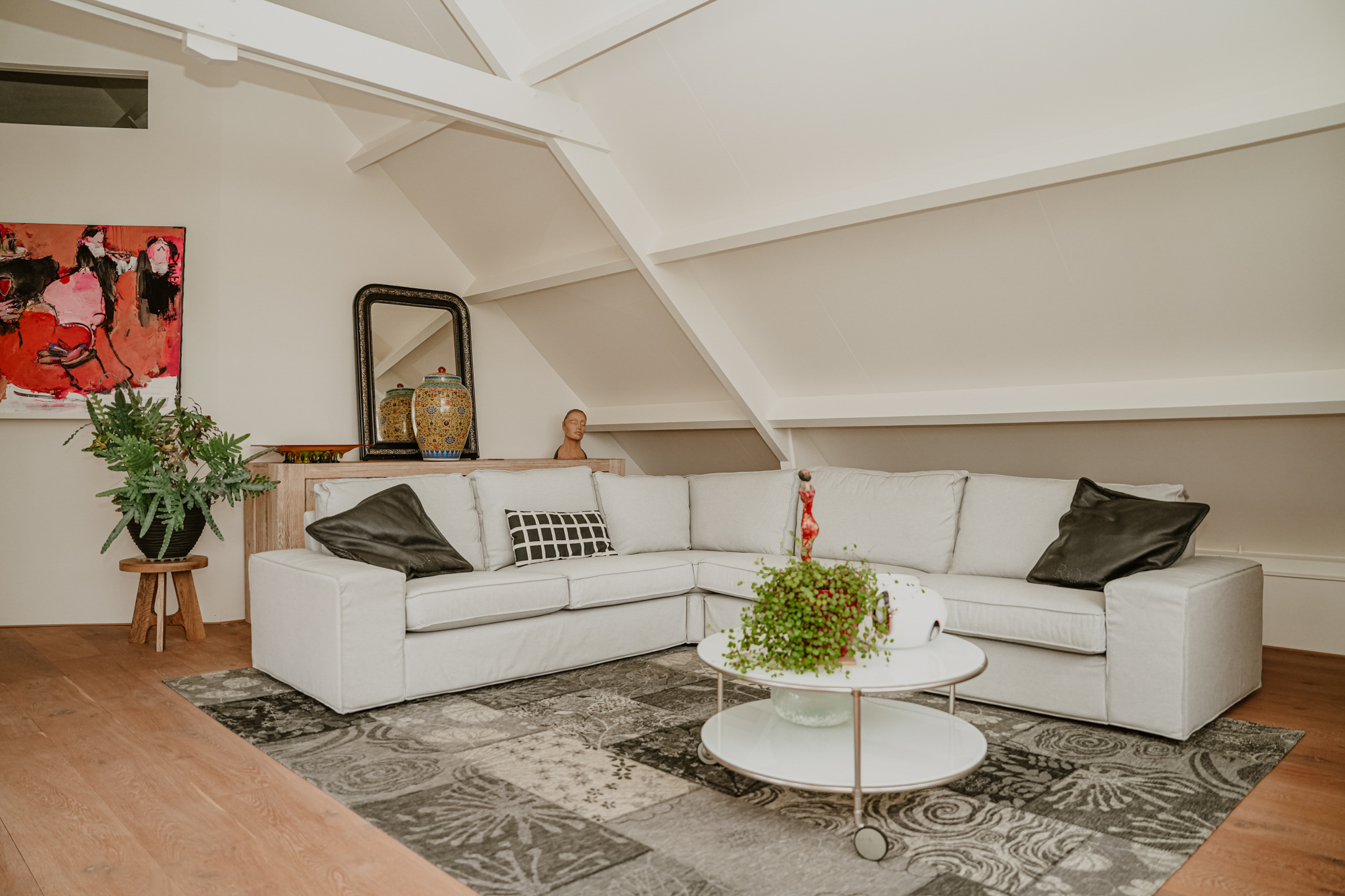 Op de verdieping liggen prachtige eiken vloerdelen. Aan de westzijde van het oorspronkelijke dijkhuis bevindt zich een riante slaapkamer met kleedkamer en de 2e badkamer. Deze badkamer is speels ingedeeld met een inloopdouche, toilet en dubbele wastafel en heeft een natuurstenen vloer.
