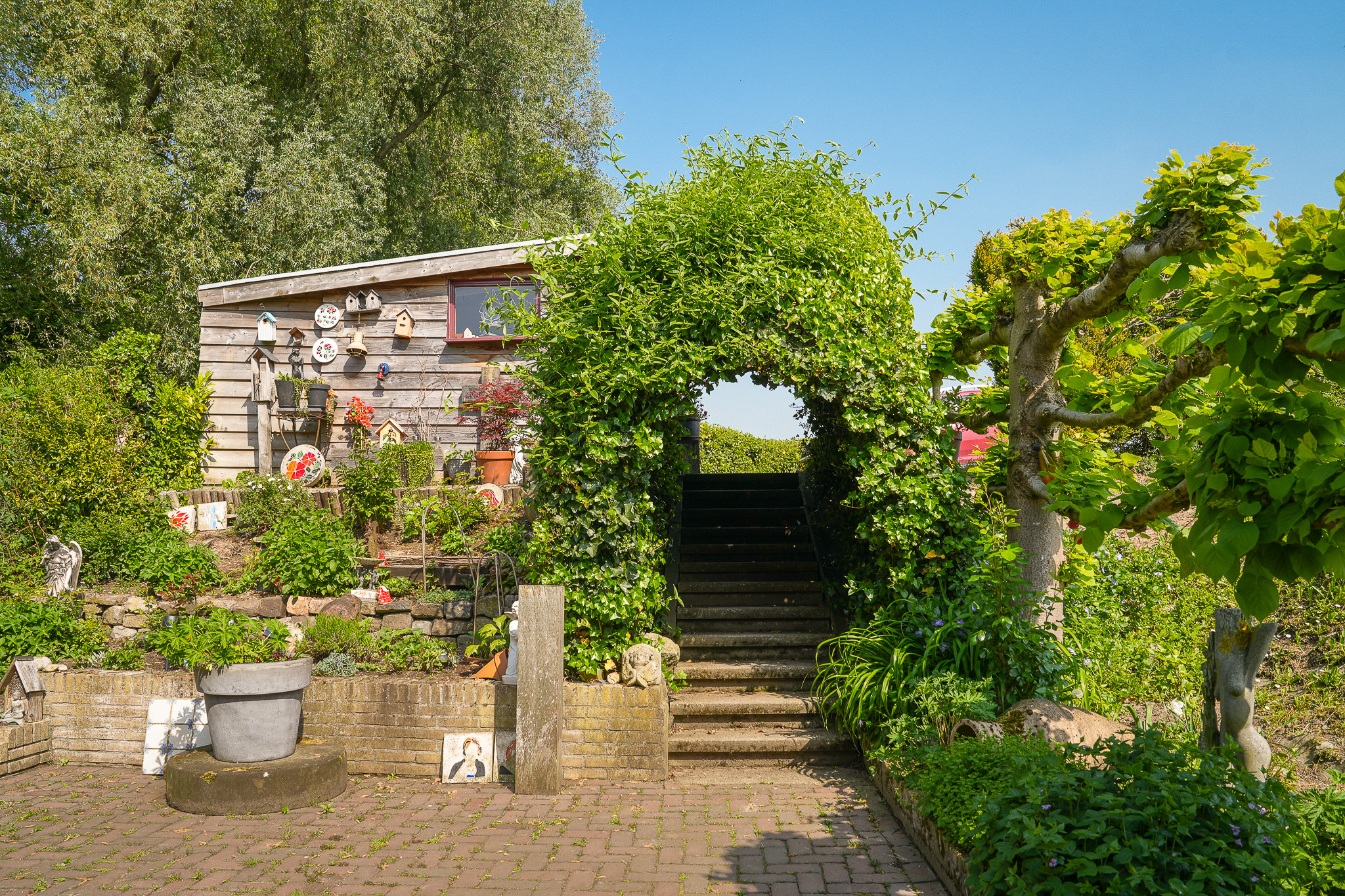 De tuin met diverse terrassen, houtopslag, mooie beukenhagen en een oude hoogstam fruitboom heeft een beplanting die bestand is tegen een hoge waterstand van de rivier mocht zich dit in de winter voordoen.